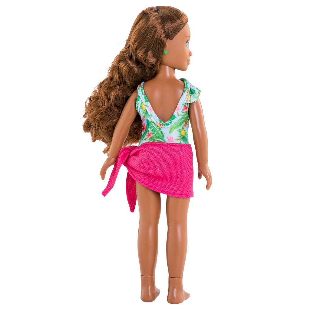 De Melody at the beach-box bestaat uit Melody, een etalagepop van 28 cm groot en 6 accessoires: zonnebrandcrème, zonnebril, waterfles, strandlaken en strandtas. Melody heeft een vrij natuurlijk gezicht met fijne gelaatstrekken en ze ruikt naar vanille. Haar ogen zijn geschilderd en ze heeft lang, golvend, lichtbruin haar. Ze draagt een mooi badpak, een bijpassende sarong en een paar afneembare oorbellen. Melody heeft een realistisch tienerlichaam. Ze kan zelfstandig staan en zitten. De Corolle Girls zijn verkrijgbaar in meerdere modellen (Valentine 5610601, Luna 5610603 en Zoé 5610604). Geschikt voor kinderen vanaf 4 jaar oud.