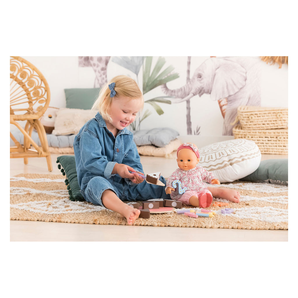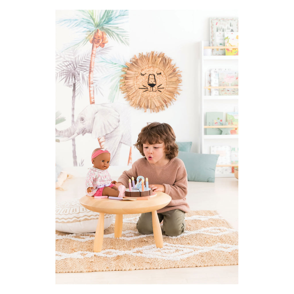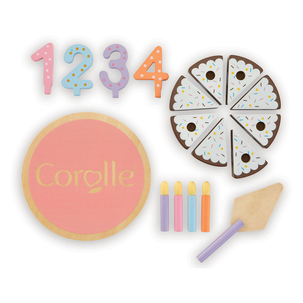 De houten verjaardagstaart van Corolle is perfect voor het vieren van de verjaardag van een grote babypop van 36 of 42 cm. Het bevat 18 accessoires: acht stukken cake met klittenband, klaar om te worden geserveerd, vier cijfers (1, 2, 3 en 4), vier kaarsen, een taartschep en een dienblad.