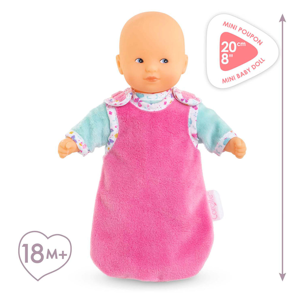 Mini Calin Bonne Nuit Papillons, pop met 2 kledingstukken. Kenmerken • Pop met pyjama pakje en slaapzakje • Vinyl gezichtje met subtiele vanille geur • Label voor telefoon gegevens • Wassen op fijne was programma • Geschikt voor kinderen vanaf 18 maanden • 20 cm groot