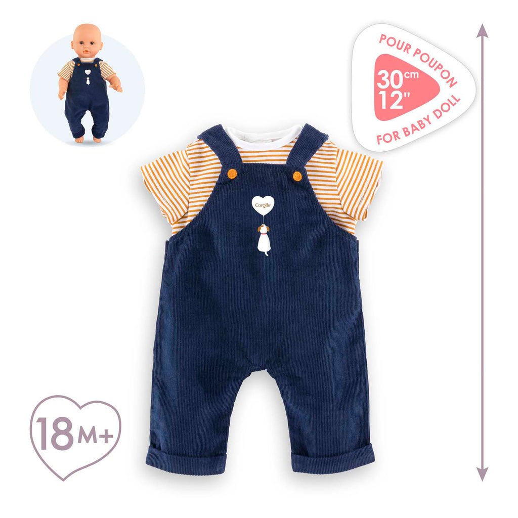 Voor een casual outfit is de marineblauwe T-shirt & overall ideaal voor kleine Mon Premier Poupon Corolle-poppen van 30 cm. Deze set bestaat uit een marineblauwe corduroy overall en een bruin-wit gestreept T-shirt in één. Een mooie zeefdruk van een hond die een bal vasthoudt, maakt deze overall compleet. Gemaakt van zachte en duurzame materialen, is hij gemakkelijk aan te trekken dankzij de klittenbandsluiting, aangepast aan de behendigheid van kleine handjes. Deze 2-in-1 set zorgt er ook voor dat er niets kwijtraakt! Deze outfit is geschikt voor kinderen vanaf 18 maanden.