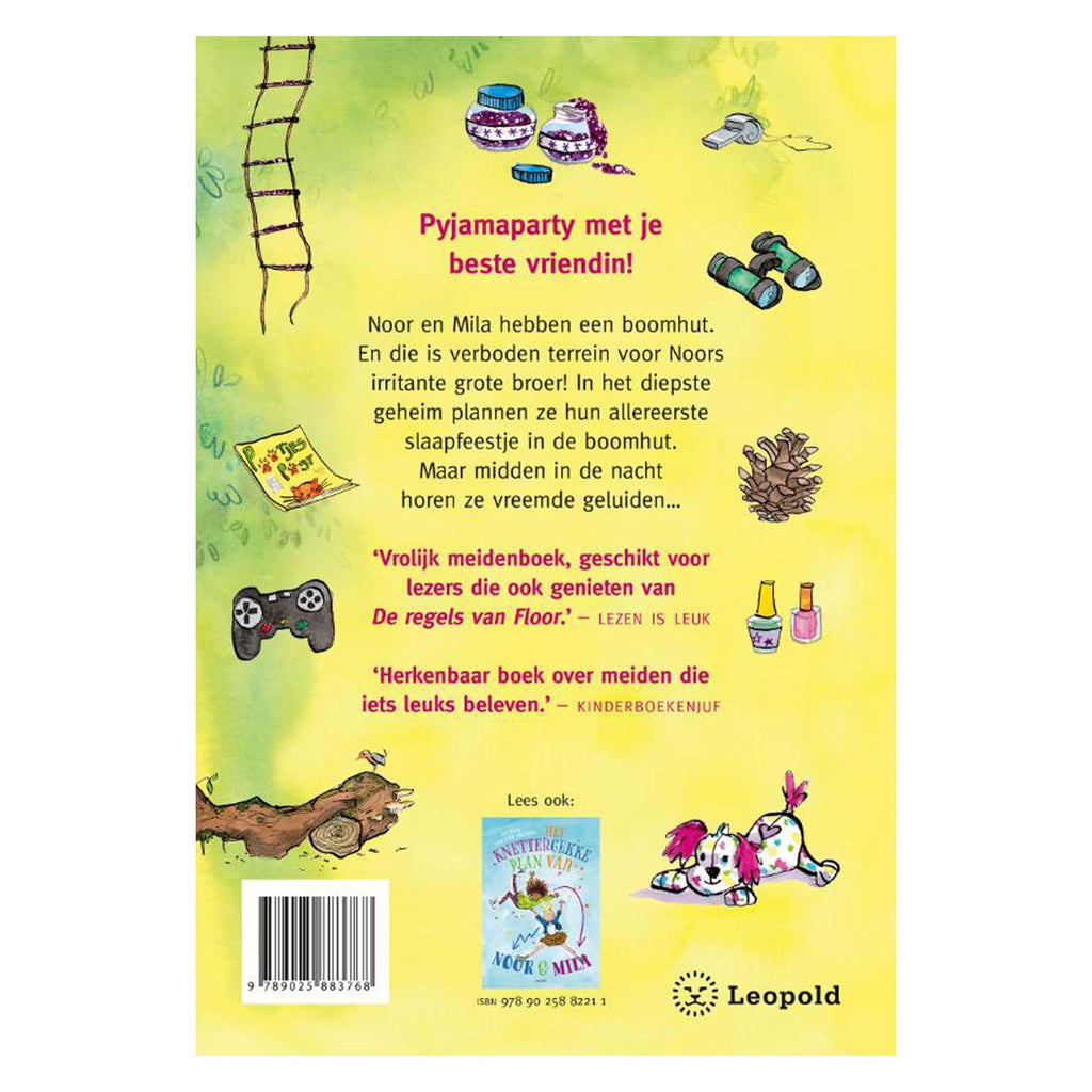 Een spannend avontuur begint voor Noor en Mila in hun verboden boomhut. Samen proberen ze deze geheime plek te beschermen tegen Noors vervelende broer, Floris. Ze hebben zelfs een slaapfeestje gepland, maar worden midden in de nacht opgeschrikt door vreemde geluiden...
