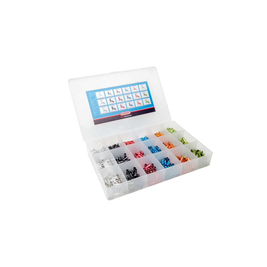 Deze doos bevat aluminium kabelhoedjes voor versnellingskabel 4,2 mm en remkabel 5.0mm en antirafledopjes voor afwerking binnendraad. Alle delen zijn beschikbaar voor navulling.