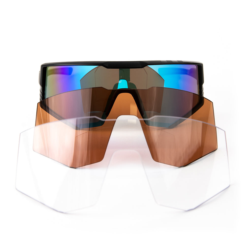 De Model Tourmalet van Lynx is een modieuze premium sportzonnebril met 3 verwisselbare lenzen. Het frame is gemaakt van TR90 thermoplast materiaal, waardoor de bril ultralicht, flexibel en zeer duurzaam is. De brillenpootjes hebben een anti-slip vlak aan de binnenzijde en het rubberen neusstuk is verstelbaar middels de metalen kern voor maximaal draagcomfort.