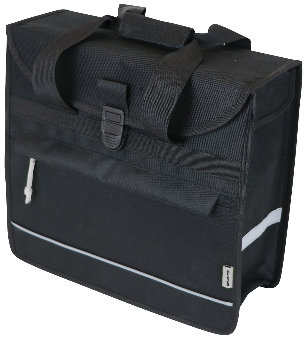 De Edge Enkele fietstas Basic Shopper is een handige ruime sterke fietstas met een inhoud van 20 liter. De zwarte tas is gemaakt van waterafstotend nylon en de regenoren aan de zijkanten voorkomen het inregenen. De Edge shopper is makkelijk en stabiel aan de bagagedrager te hangen met de twee bevestigingshaken en vast te maken met de klittenbandsluiting. De tas is afsluitbaar met de handige kliksluiting. Met de draagriemen is de fietstas in een handomdraai van de bagagedrager te halen en neemt u de tas makkelijk mee. De shopper heeft ook een klein handig voorvak afsluitbaar met een ritssluiting. De harde bodemplaat zorgt ervoor dat de tas in model blijft. In het donker bent u extra zichtbaar door de grote reflectievakken aan de voor- en achterzijde. De tas heeft een afmeting van 37x34x13 cm. Productspecificaties: Inhoud: 20 Liter Afmeting: 37 x 34 x 13 cm Gemaakt van waterafstotend nylon Kleur: zwart