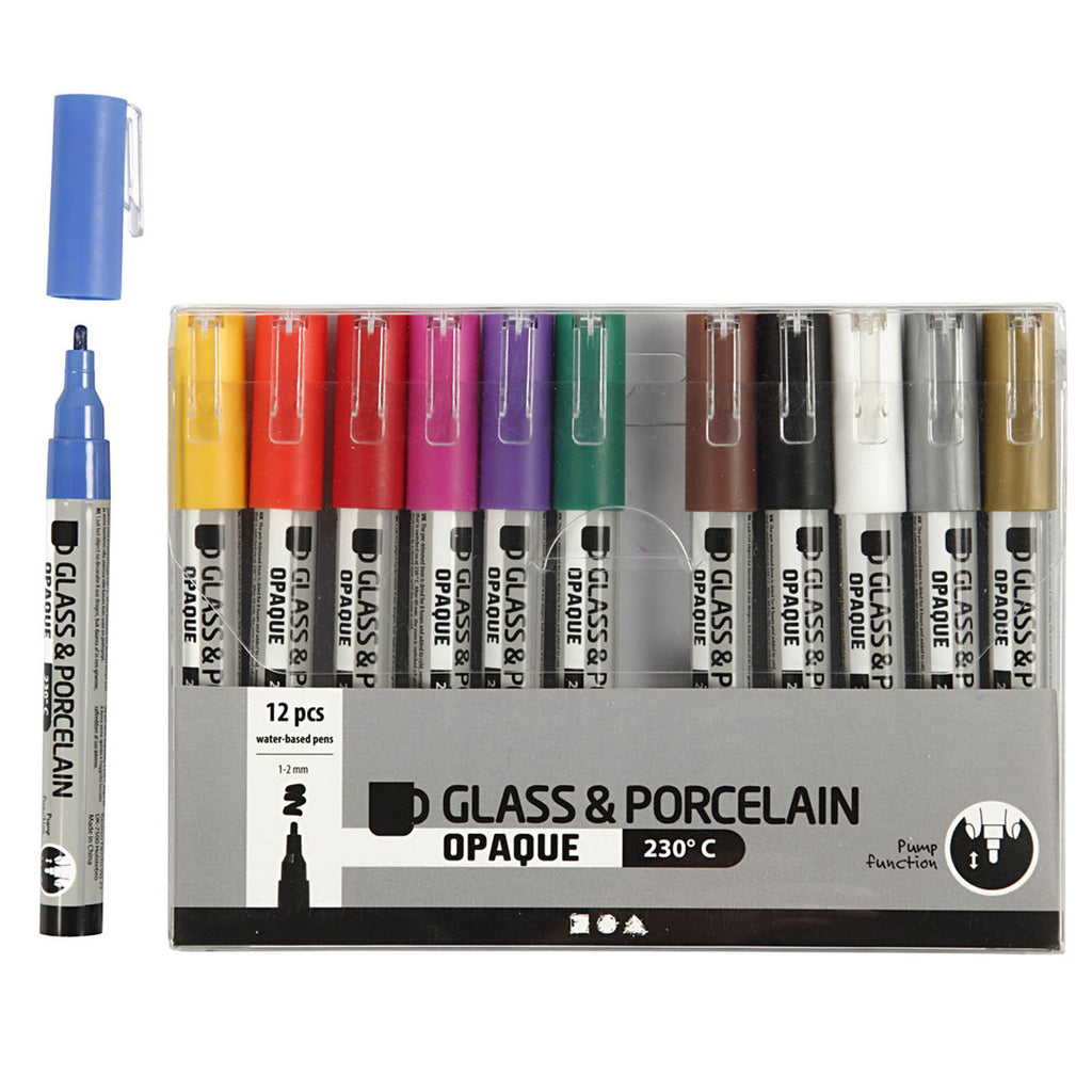 Glas- & Porseleinstiften, 12st. Dekkende stift op waterbasis geschikt voor zowel glas als porselein. Het gedecoreerde item is vaatwasmachinebestendig op lage temperatuur na fixatie in de oven. . Deze marker hecht het beste op een schone, droge en vetvrije ondergrond. Schud de marker goed en duw deze op de punt voorzichtig op en neer totdat de verf naar de punt stroomt. Laat het versierde artikel 8 uur drogen, plaats het in een koude oven (geen heteluchtoven of stoomoven). Stel de temperatuur in op 230°C. Het item is na 40 minuten gefixeerd. Zet de oven uit en laat het item afkoelen in de oven.