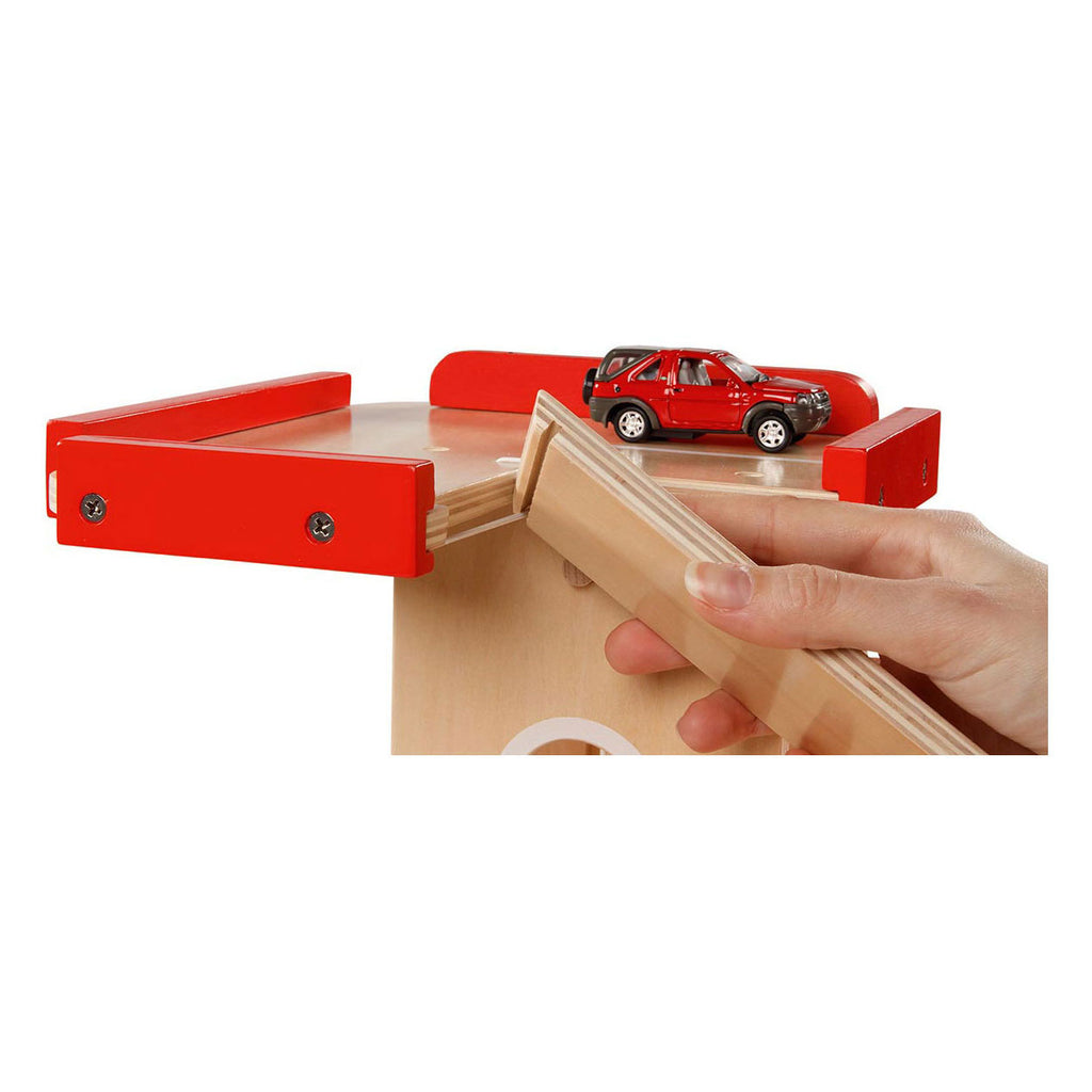 Geweldig houten speelgoed voor autoliefhebbers: met drie niveaus zorgt de parkeergarage voor uren speelplezier. De auto's kunnen bijgetankt worden bij twee benzinepompen en naar andere niveaus van de garage met de lift. De wasstraat met vilten stoffen maakt de auto's brandschoon. De hellingen zijn zeer eenvoudig te bevestigen. Let op: geleverd zonder voertuigen. Afmeting: 51,9 bij 31,4 bij 38,5 centimeter. Materiaal: hout. Geschikt voor kinderen vanaf 3 jaar oud.
