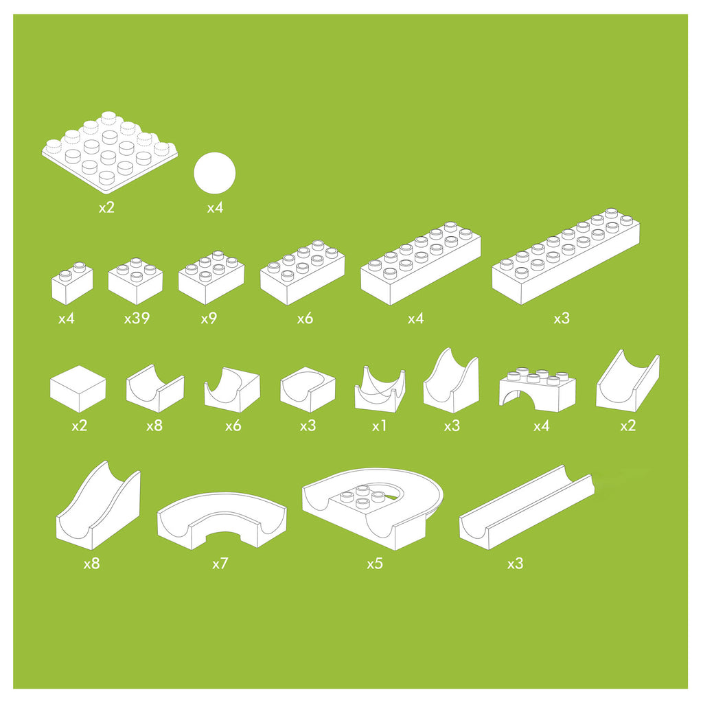 Deze Hubelino Knikkerbaan Basisset bevat alles wat je nodig hebt om een geweldige knikkerbaan te bouwen, ideaal voor beginnende knikkerbaan bouwers. Gebruik je eigen fantasie en creativiteit om de leukste knikkerbanen te maken, of gebruik de voorbeelden uit de Hubelino App. Met deze basisset heb je uren speel- bouw- en knikkerplezier! De knikkerbanen en bouwblokken zijn gemaakt van kwalitatief en duurzaam kunststof, hierdoor heb je er langer plezier van! In deze set zit alles om een toffe knikkerbaan te bouwen: - 50 baanelementen - 67 constructiebouwstenen - 4 knikkers - 2 grondplaten