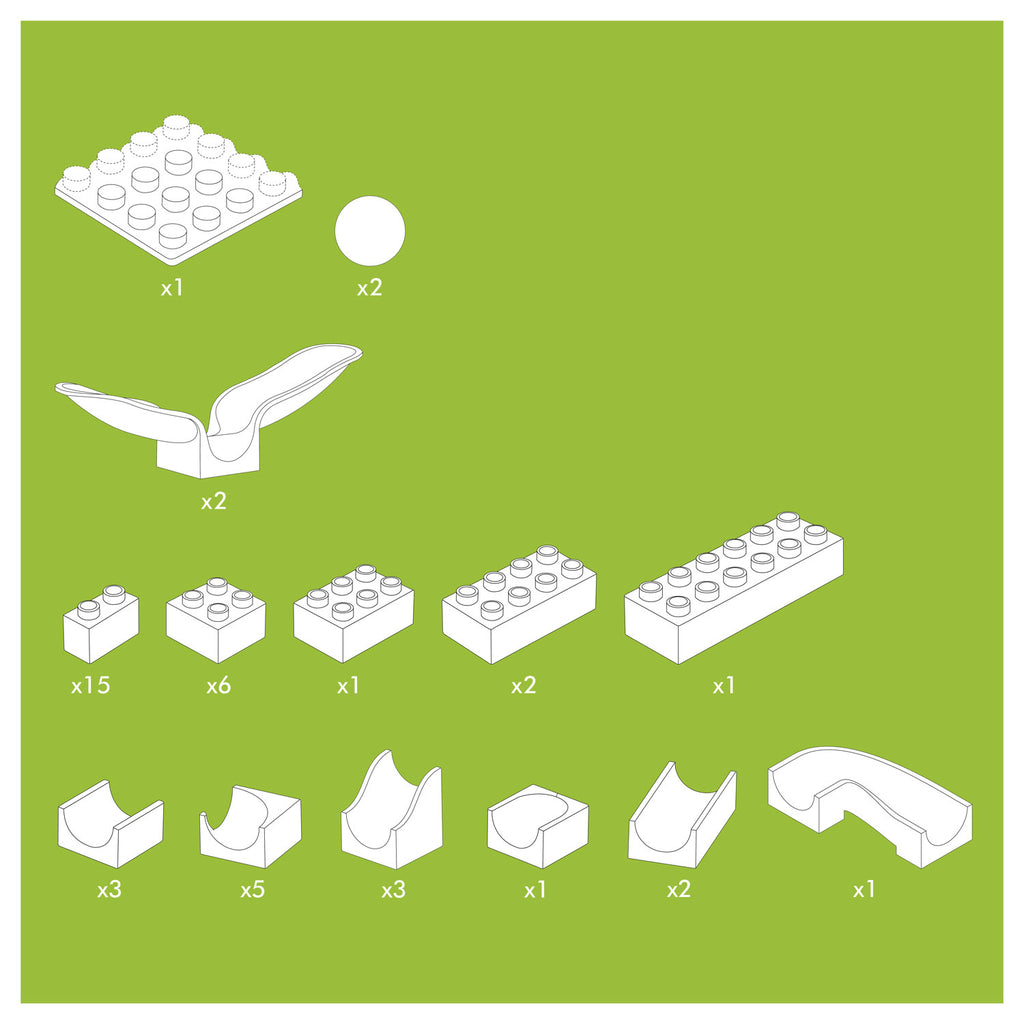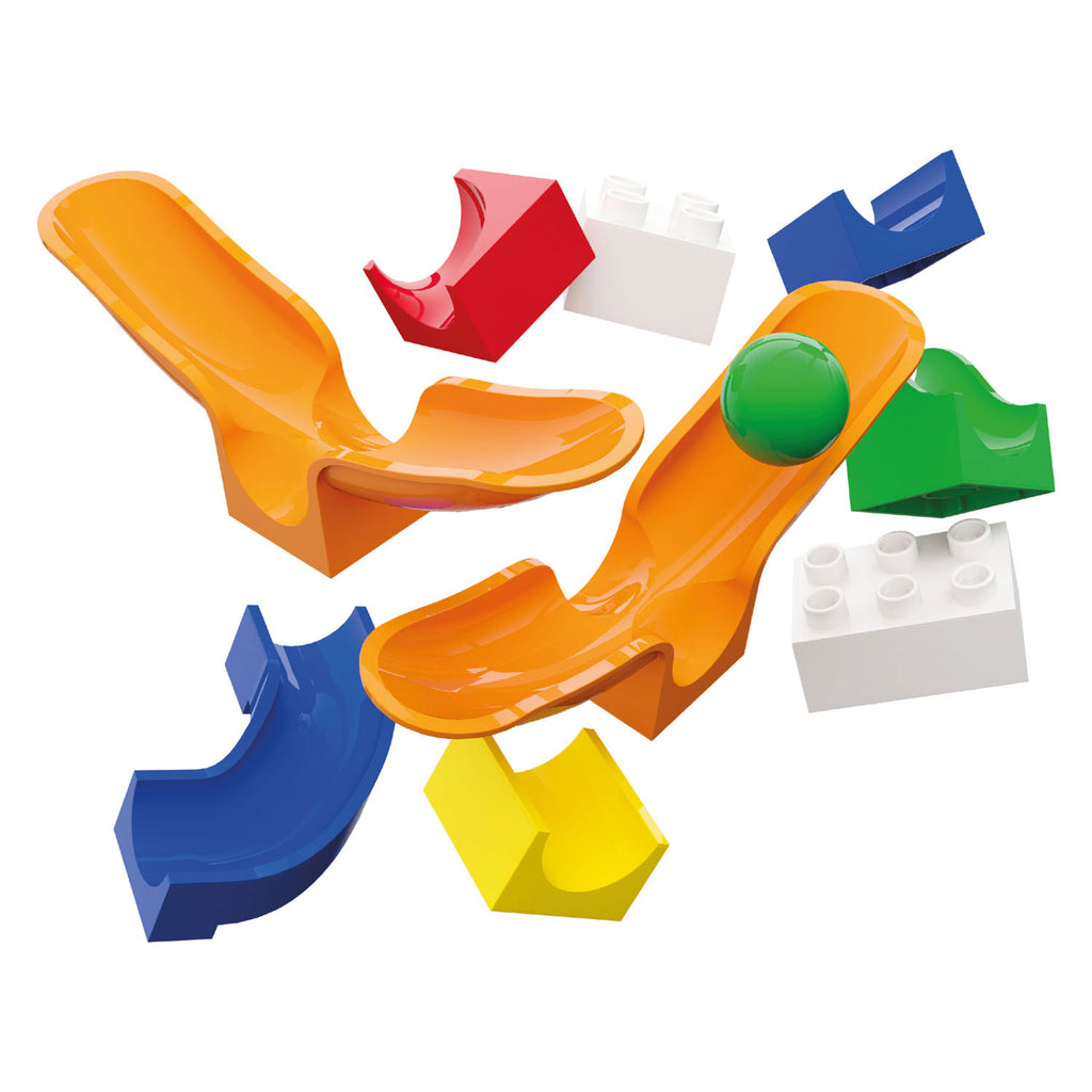 Wil je nog meer snelheid? Daag de bouwmeester in jou dan eens uit met de nieuwe slingergoot-set van Hubelino! Met zijn fraaie slingertechniek biedt deze set jou spannende en onvoorspelbare mogelijkheden: rolt je knikker naar de volgende goot of neemt hij onverwacht een andere wending?Met de twee slingergoten van deze set kan de knikker vier verschillende richtingen opgaan. En net als alle Hubelino-producten kan ook deze 46-delige set met alle andere bouwelementen van Hubelino gecombineerd worden. Plaats de slingergoten in je bouwwerk en creëer een onvoorspelbaar en nog spannender knikkerlabyrint! De set bevat 2 slingergooten, 16 baanelementen, 25 constructiebouwstenen, 1 grondplaat en 2 knikkers.