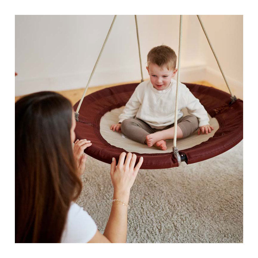 Ronde nestschommel in loungestijl. Hier kan je mee thuiskomen! De nieuwe ronde nestschommel met een diameter van 90 cm biedt niet alleen comfortabel schommelplezier, maar is ook echte blikvanger. Het gemêleerde nestoppervlak en de prachtige roodtint genaamd “Amber” aan de rand passen in elk trendbewust tuinontwerp. Technisch gezien overtuigt het hoogwaardige en slijtvaste Textilene-materiaal waarvan het ligvlak is gemaakt. Hetzelfde geldt voor de weerbestendige frameconstructie, die belastbaar is tot 150 kg. Deze is gegalvaniseerd en gepoedercoat. Hierdoor blijft de nestschommel jarenlang onberispelijk mooi. Heel praktisch: dankzij de eenvoudige steekverbinding is de schommel in een handomdraai en zonder gereedschap opgebouwd. Let op! Alleen voor huishoudelijk gebruik. Alleen gebruiken onder direct toezicht van volwassenen. Niet geschikt voor kinderen onder de 36 maanden i.v.m. lange snoeren. • HARMONIOUS LOOK: Met een stijlvolle look in lounge-design • ONGECOMPLICEERD: montage zonder gereedschap • WEERBESTENDIG: Geschikt voor buitengebruik dankzij het gegalvaniseerde en gepoedercoate frame • UITZONDERLIJK STABIEL: Veilig schommelen dankzij het solide 25 mm ronde buisframe • STERK: Voor het hele gezin tot 150 kg • AFMETING: doorsnede 90 centimeter • Geschikt voor kinderen vanaf 3 jaar oud