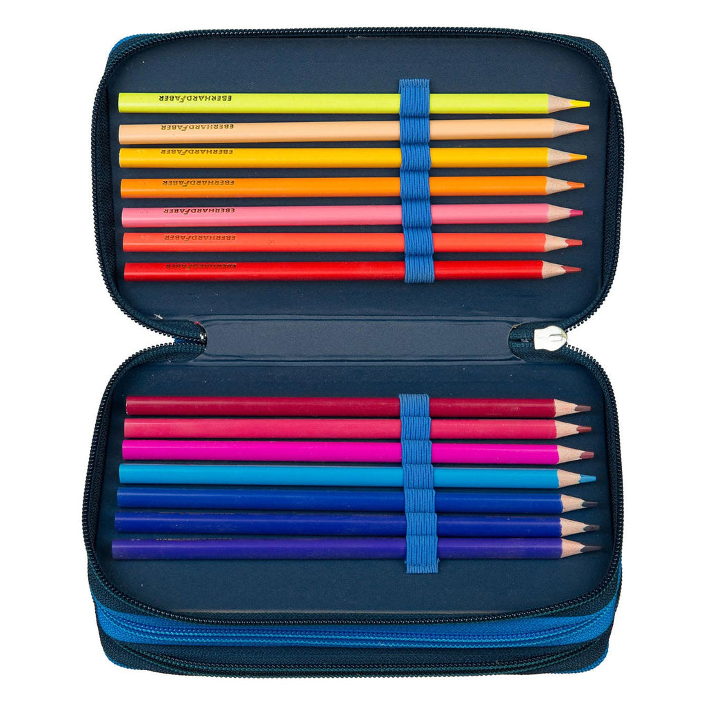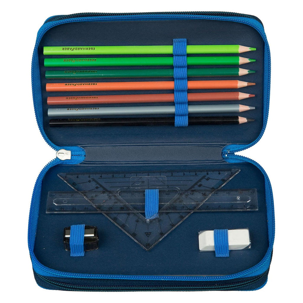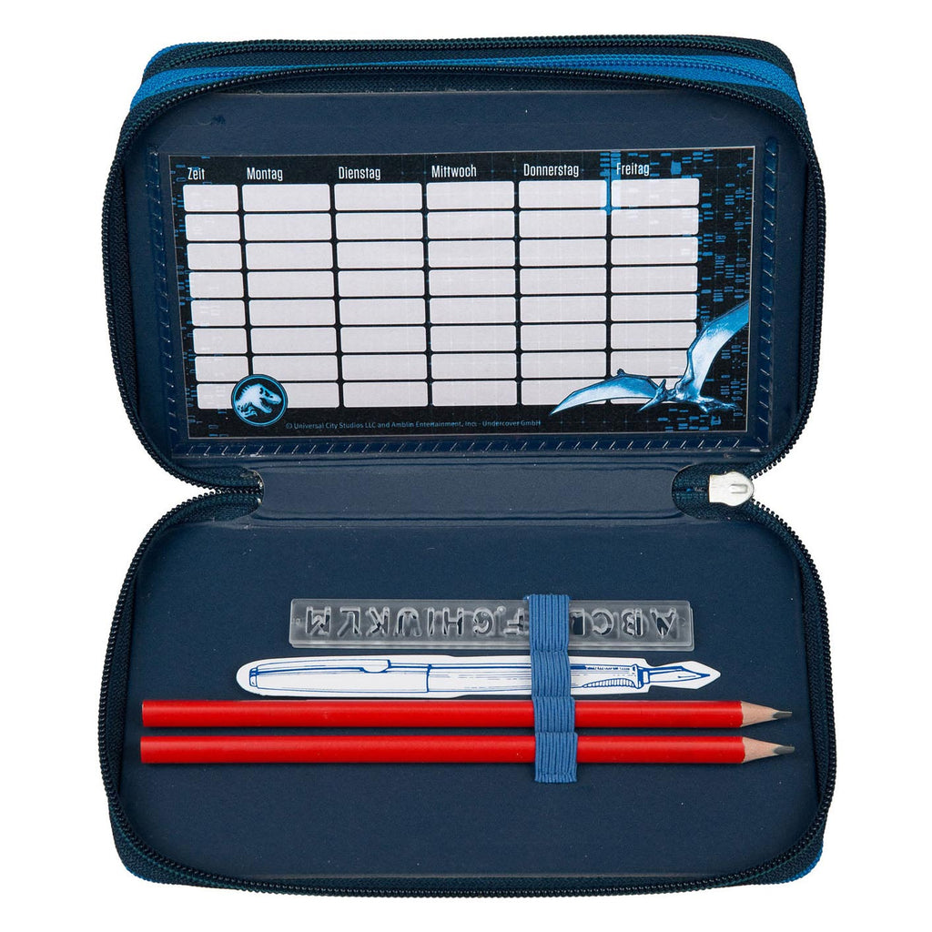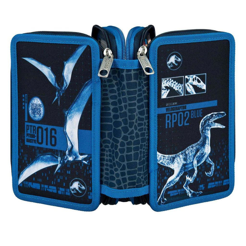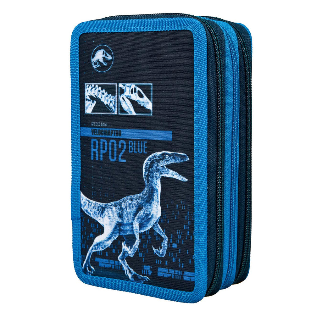 Gevulde 3-vaks etui van Jurassic World met een velociraptor voorop. De etui is zwart met lichtblauw gekleurd. Inhoud: 21 kleurpotloden, 2 potloden, 1 gum, 17 cm liniaal, geodriehoek, puntenslijper, lesrooster, 2 ABC-stencils. Afmeting: 12 bij 19 bij 7 centimeter. Geschikt voor kinderen van 3 tot 8 jaar oud.
