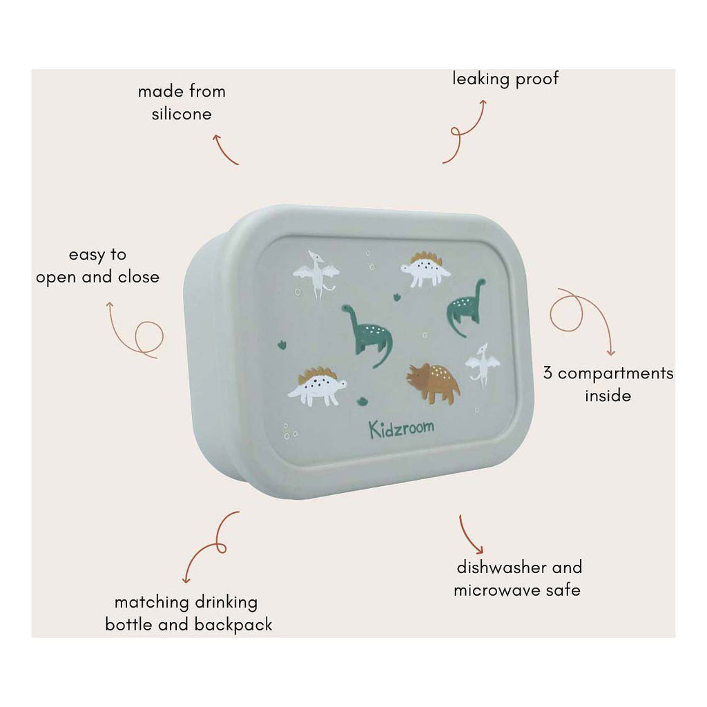 Wat een lieve lunchbox! Deze prachtige lunchbox van Kidzroom uit de Lovely Lunch-collectie is een echte must-have voor kinderen. De lunchbox heeft een stijlvolle groene kleur en is versierd met dino's. Dankzij het zachte siliconenmateriaal is de lunchbox eenvoudig te openen en te sluiten, perfect voor kleine kindjes. De binnenkant is slim ingedeeld in drie compartimenten, zodat je alle onderdelen van de lunch netjes en vers kunt houden. Door het silicone materiaal kan hij in de magnetron en in de vaatwasser. Praktisch én schattig! Voeg deze betoverende lunchbox van Kidzroom vandaag nog toe aan je assortiment.
