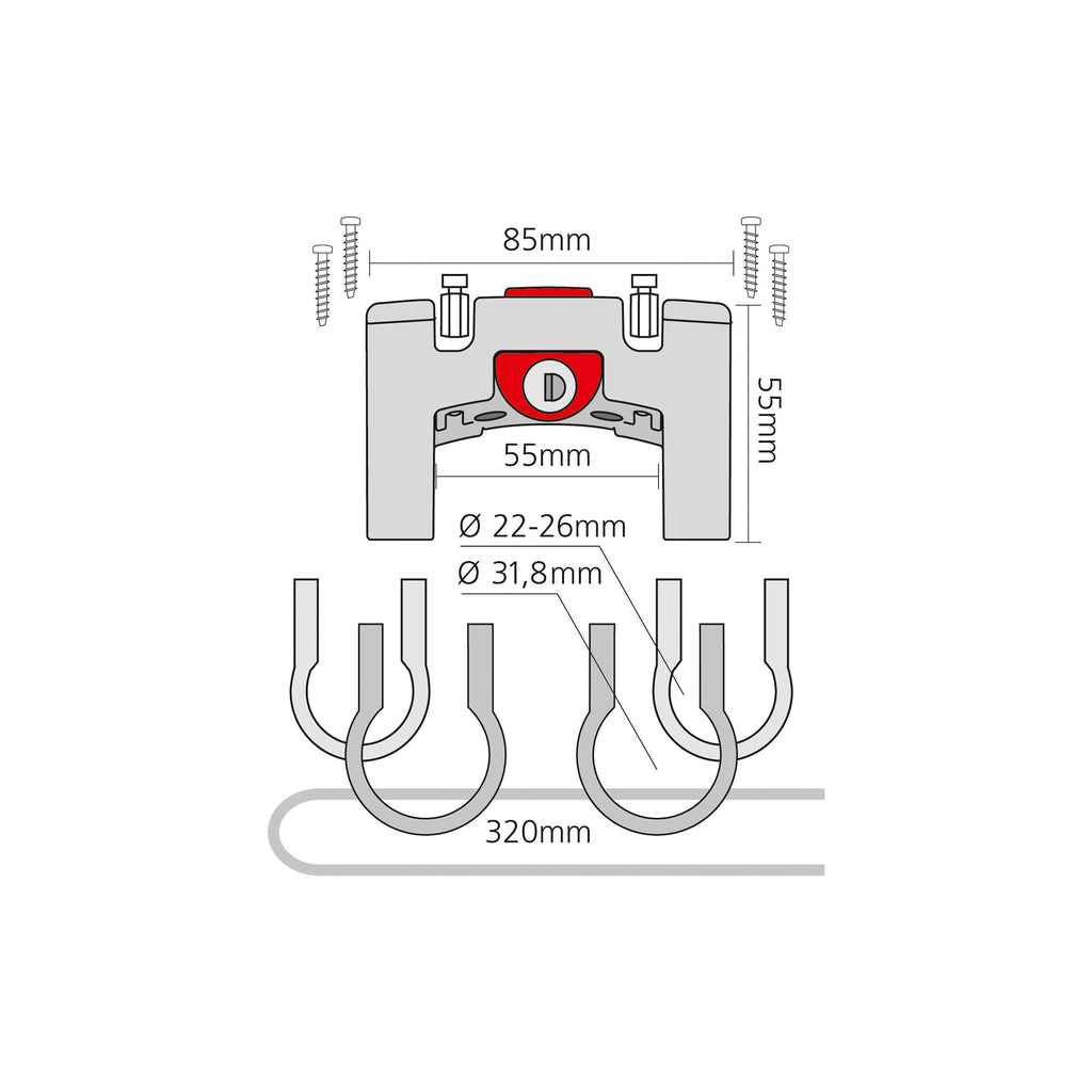 Stuuradapter Universeel met Slot. Zwart-rood voor sturen met een diameter van 22–26 mm en 31,8 mm. Wilt u uw mandje of shopper veilig op uw fiets laten zitten? Dan is de Stuuradapter met slot de juiste keuze. De rode knop integreert een hoogwaardig metalen slot. Alle accessoires kunt u na het winkelen op uw fiets klikken en eenvoudig losmaken met een druk op de rode knop. Deze adapterversie is afsluitbaar en bevat 2 standaard klemmen voor sturen met een diameter van 22–26 mm en 2 oversized klemmen voor sturen met een diameter van 31,8 mm. Zelfs bij zware belasting zakt de adapter niet naar beneden dankzij de gepatenteerde veiligheidskabel. Met de KLICKfix stuuradapter UNIVERSAL - afsluitbaar kan een tas of mand in een handomdraai aan de fiets bevestigd en weer weggenomen worden. De adapter zit veilig op het stuur dankzij de kabelspanning. Deze afsluitbare versie van de stuurhouder heeft een geïntegreerd slot ter bescherming tegen diefstal. Details: • vergrendelbare stuurhouder voor KLICKfix stuurmanden en tassen • met slot voor diefstalbeveiliging • snel te monteren • accessoires kunnen gemakkelijk worden vastgeklikt en losgemaakt met één druk op de knop • voor alle gangbare sturen (Ø 22-26 mm en 2 oversized klemmen voor stuur Ø 31,8 mm) • geschikt voor accessoires tot 7 kg • twist-proof dankzij kabelspanning Technische gegevens: • max. draagvermogen: 7 kg • gewicht: ca. 100 g • compatibiliteit: voor stuur Ø 22-26 mm en 31,8 mm Leveringsomvang: • 1 x KLICKfix stuuradapter UNIVERSAL - afsluitbaar • incl. sleutel, 2 paar klemmen voor stuurdiameter en schroeven en staalkabel voor montage