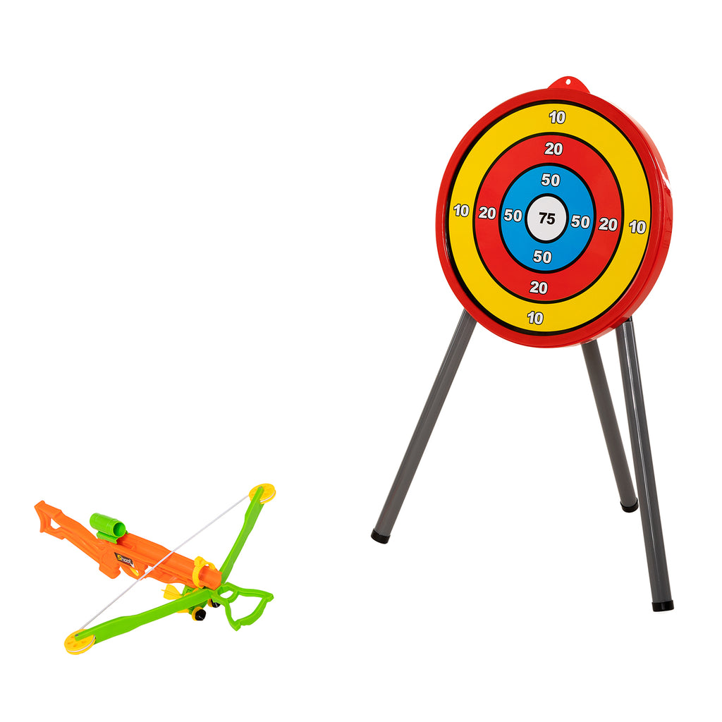 Deze gekleurde is geschikt voor binnen en buiten. De kruisboog heeft een eenvoudig spanningsmechanisme. Zet het schietbord neer en neem een aantal stappen achteruit. Plaats de pijlen met zuignappen in de kruisboog en richt de pijlen. Ga jij voor het hoogste aantal punten? De set bevat een kruisboog, doelwit en vier pijlen. Geschikt vanaf 3 jaar.