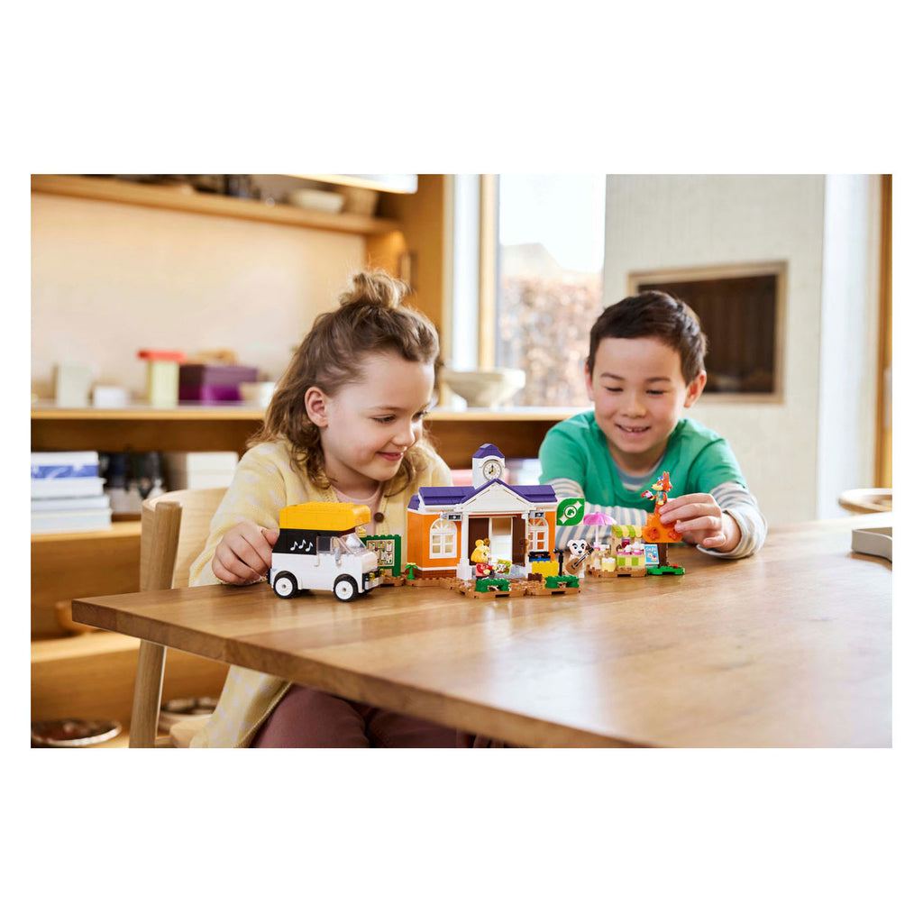 Meisjes en jongens vanaf 7 jaar kunnen hun eigen verhalen geïnspireerd op de Animal Crossing™ videogames bedenken met het K.K.'s pleinconcert (77052) bouwspeelgoed. Eerst bouwen ze de scènes van hun scherm, daarna nemen ze met de 3 LEGO® Animal Crossing minifiguren en vele herkenbare speelgoedaccessoires uit de game het fantasiespel overal mee naartoe! Kinderen bereiden zich voor op het concert van K.K. door zijn speelgoedmicrofoon van het dak van de camper te halen, op de speelgoedgitaar te spelen of zich bij Isabelle aan te sluiten voor groepsgymnastiek. Ze praten bij met Audie in het café voordat ze aan de slag gaan in het gemeentehuis, waar ze een doe-het-zelfplan kunnen krijgen, beloningen kunnen inwisselen bij de geldautomaat en de recyclekist kunnen controleren op nieuwe voorwerpen. Net als in de game bevat de boom een verrassing en kan de vlag van de servicebalie worden gepersonaliseerd. Kinderen kunnen de bouwplaten anders indelen om hun LEGO Animal Crossing set te veranderen.