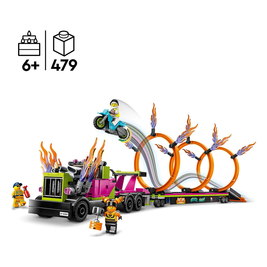 Haal de show in huis met de LEGO City Stuntz Stunttruck & Ring of Fire-uitdaging (60357) set. Dit actie speelgoed voor kinderen van 6 jaar en ouder bevat een coole truck met vurige uitlaatpijpen en een aanhangwagen met een lanceerhelling die omlaag kan worden gebracht en 3 verstelbare vuurringen voor urenlang spannend bouw- en speelplezier. De doos bevat ook 2 City Stuntz minifiguren, een stuntmotor met vliegwielaandrijving en een vrachtwagenchauffeur. Kinderen kunnen de enorme truck in positie helpen rijden, de vuurringen klaarzetten en de helmen op de figuurtjes plaatsen voor een spannende race met de speelgoed motor en vrachtwagen. Er is volop spanning en sensatie - de voertuigen rijden vanzelf met hoge snelheid over de lanceerhelling, dwars door de vuurringen. Voor een nog spannendere uitdaging kunnen kinderen de afstand tussen de ringen groter maken. Hoe ver kan de motor rijden? Leuk en spannend speelgoed cadeau voor kinderen vanaf 6 jaar, waarmee ze gedetailleerde gebouwen en inspirerende personages ontdekken voor allerlei leuke rollenspelen. Combineer deze speelset met andere sets uit de LEGO City Stuntz reeks voor nog meer stuntactie. Afmetingen: de truck is ca. 9 cm hoog, 18 cm lang en 9 cm breed. Bevat 479 onderdelen.