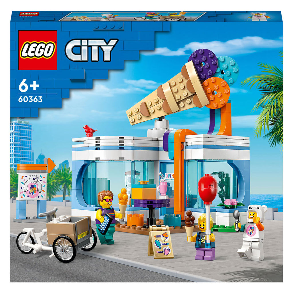 Stap op de bakfiets en rijd naar de LEGO® City IJswinkel. Help de medewerker om heerlijke ijsjes en milkshakes te serveren aan tevreden klanten. Deze salon is echt cool! Het is de ideale bestemming voor een verjaardagsfeestje met een nette toonbank, blender, koelkast en een zitgedeelte in de buitenlucht waar vrienden en gezinnen kunnen relaxen terwijl ze het menu bekijken.