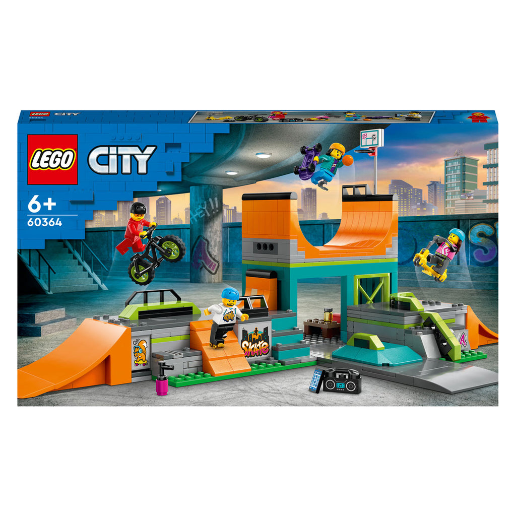 Pak je veiligheidsuitrusting en ga naar het LEGO® City Skatepark. Kies uit een crossfiets, skateboard, step of rolschaatsen. Verwissel en combineer de hellingen en uitrustingen om allerlei stunts en trucs uit te voeren. Grijp de basketbal en werp hem met een geweldige dunk in de ring! Er is zelfs een ruimte waar je met je vrienden kunt genieten van een verkoelend drankje. Dit is het skatepark van je dromen!
