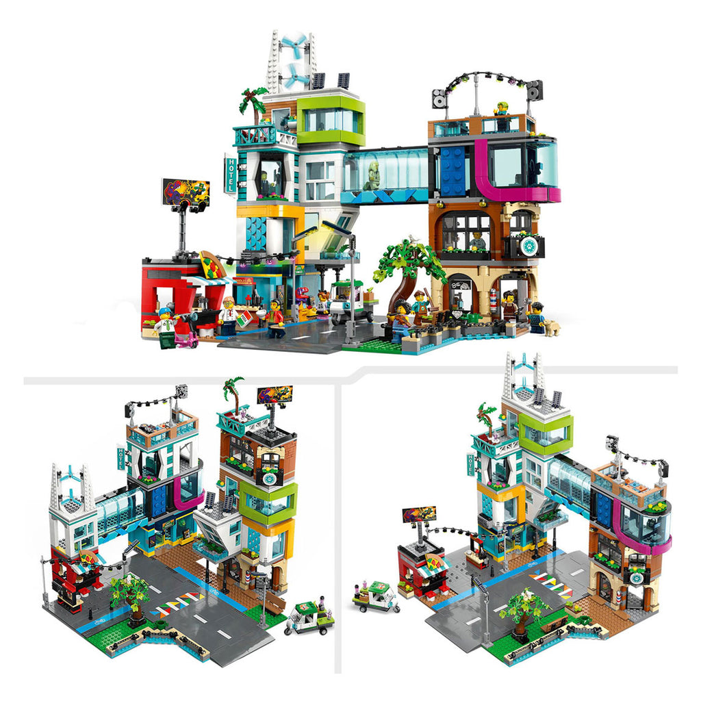 Welkom in de binnenstad van LEGO® City! Hier vind je een park, een kapperszaak, een dierenkliniek, een blogstudio en een discotheek op het dak. Een overdekte brug leidt naar een tweede gebouw van 3 verdiepingen met een stripboekenwinkel, een elektronicawinkel, een conciërgekamer en een modern hotel. Zonnepanelen en windturbines leveren schone energie, terwijl een gezellig streetfoodgedeelte de inwoners voorziet van pizza's, verse drankjes en noedels. Deze plek is geweldig!