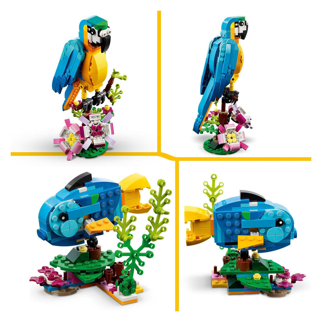 Met deze geweldige LEGO 3-in-1 set kunnen kinderen 3 verschillende exotische dierenmodellen bouwen. Zo kunnen ze een kleurrijke papegaai bouwen die op een boomtak zit en deze vervolgens ombouwen tot een speelse vis die diep in de zee zwemt of een grappige kikker die zijn poten kan bewegen.