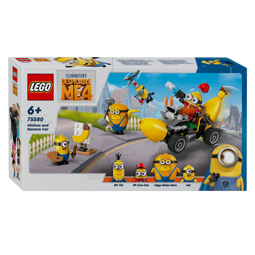 Verwen een Minions fan met de LEGO® Verschrikkelijke ikke 4 Minions en bananenauto (75580). Dit creatieve speelgoed voor kinderen bestaat uit 4 Minions, een kleine speelgoedauto en accessoires. Een leuk cadeau voor jongens en meisjes vanaf 6 jaar en Minions fans. Op zoek naar een LEGO Minions set, kleine speelgoedauto of een leuk cadeautje? Deze Minions bananenauto heeft een afneembare motor, plus 4 Minions en accessoires. Mega Minion Dave kan met de ene hand de motor optillen en met de andere een gewichthefstang. Mel schildert een banaan, terwijl geheim agent AVL Minion Tim voorbij vliegt met draaiende rotorbladen op zijn hoofd en een afstandsbediening in zijn hand. Op de grond staat zijn werkstation, gevuld met speciaal gereedschap, waaronder een röntgenbril. Pit Crew Minion Ron heeft luierdienst bij de commode. Hij heeft zelfs een pistool voor het afschieten van vieze luiers. Bouwers kunnen digitaal plezier beleven door in te zoomen en sets te draaien in de LEGO Builder app. Minions speelgoed voor kinderen - verwen jongens en meisjes die fan zijn van Illuminations Verschrikkelijke ikke 4 met dit leuke Minions en bananenauto speelgoed voor kinderen vanaf 6 jaar Minions speelgoed - inclusief een bananenauto met een afneembare motor, de Minions Mel, Pit Crew Ron, geheim agent AVL Tim en Mega Minion Dave en veel accessoires Creatieve Minions bouwset - met een kleine speelgoedauto voor kinderen, 4 verschillende Minions figuren en een reeks aan gereedschappen en gadgets barst dit Minions cadeau van de speelmogelijkheden Leuke accessoires - Dave's gewichthefstang, de draagbare röntgenbril en helikopterhoed van geheim agent AVL Tim, Pit Crew Rons pistool voor vieze luiers, een banaan en een LEGO® schilderij van een banaan Minions cadeautip - dit leuke filmspeelgoed is een cadeau voor elke Minion fan en voor kinderen die een van de Verschrikkelijke ikke films van Illumination hebben gezien 3D bouwinstructies - kinderen kunnen de LEGO® Builder app downloaden voor een complete bouwervaring met digitale functies om in te zoomen en modellen in 3D te draaien, sets te bewaren en hun voortgang bij te houden Meer Minions speelgoed voor kinderen - er zijn nog meer LEGO® Verschrikkelijke ikke 4 speelsets (apart verkrijgbaar) voor kinderen die Minions spulletjes verzamelen en sets willen combineren Draagbaar Minions speelgoed - de bananenauto in deze 136-delige set is ca. 6 cm hoog, 13 cm lang en 4 cm breed
