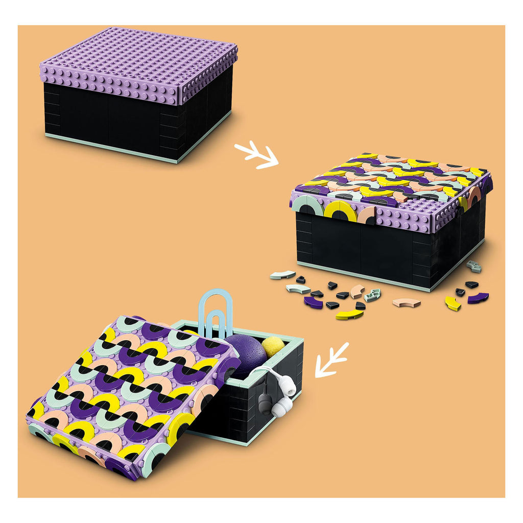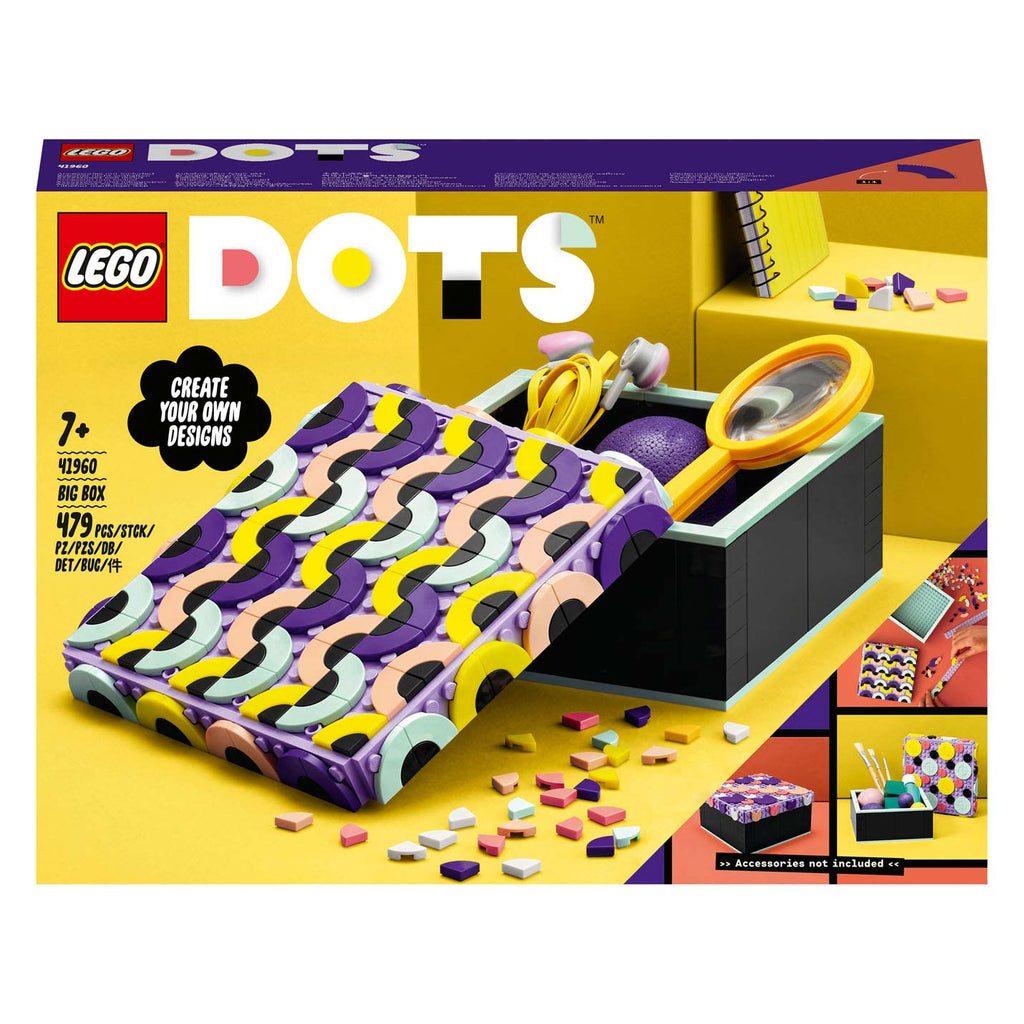 LEGO DOTS 41960 Grote Box Ben je op zoek naar een leuk en handig knutselcadeau voor een kind van 6 jaar of ouder? Verras het dan met deze creatieve LEGO® DOTS Grote doos (41960) set! De set bestaat uit een grote zwarte doos met afneembaar deksel, plus een heleboel felle neonkleurige en zachte pastelkleurige tegels om hem mee te versieren. Het bouwproces is eenvoudig en intuïtief. Kinderen kunnen de doos en het deksel in elkaar zetten en daarna eindeloze ontwerpen boven op en aan de zijkanten van het deksel maken om er hun eigen stijl aan te geven. Als de doos af is, kunnen ze hun spulletjes er veilig in bewaren en hun stijlvolle ontwerp aan iedereen laten zien. Creatieve opbergdoos Met de verschillende DOTS sets leren kinderen hoe leuk het is om op creatieve manieren met LEGO stenen te spelen. Alles wat kinderen maar kunnen bedenken is mogelijk met deze handige opbergdoos. DOTS sets zitten boordevol fantasierijke speelmogelijkheden voor creatieve kinderen. - Maken, ontwerpen en gebruiken - verras een kind of knutselfan met deze LEGO® DOTS Grote doos (41960) knutselset. Het plezier begint zodra ze de verpakking openen en de doos in elkaar zetten - Eindeloze ontwerpmogelijkheden - kinderen ontwikkelen hun fantasie en ontwerpvaardigheden wanneer ze spelen met deze doos, het afneembare zwarte deksel om te versieren en tegels in neonkleuren en pasteltinten - Creatief pakket - met deze set kun je heel wat fantasierijke, unieke ontwerpen bedenken, maar kinderen kunnen hem ook combineren met een van de LEGO® DOTS Extra DOTS zakjes of sets (apart verkrijgbaar) voor nog meer leuke designs - Leuke verrassing voor kinderen vanaf 6 jaar - creatieve doe-het-zelvers zullen deze aanpasbare set geweldig vinden. De opbergdoos, het afneembare deksel en de kleurrijke tegels vormen een leuk cadeau voor kinderen die graag knutselen - Genoeg ruimte voor allerlei schatten - de doos is ca. 14 x 14 cm en 7 cm hoog, dus kinderen hebben genoeg opbergruimte en plaats op het deksel om creatief aan de slag te gaan - Snel te versieren - dankzij de eenvoudig te volgen inspiratie in de verpakking kunnen kinderen direct aan de slag. In de set vinden ze pastel- en neonkleurige tegels, waarmee ze kunnen laten zien wat voor goede ontwerpers ze zijn - Ontwerp vol vertrouwen buiten de lijntjes - deze coole LEGO® DOTS set staat voor onbegrensde creativiteit. Met de eenvoudig in elkaar te zetten doos en deksel ontwikkelen kinderen spelenderwijs hun vindingrijkheid en zelfvertrouwen - Eindeloze speelmogelijkheden - met LEGO® DOTS sets ervaren kinderen hoe leuk het is om met LEGO stenen te spelen door hun eigen sieraden of kamerdecoraties te maken en aan hun eigen stijl aan te passen - Kwaliteit zonder compromis - LEGO® onderdelen voldoen al sinds 1958 aan strikte industrienormen, waardoor ze elke keer weer goed op elkaar passen - Veiligheid voor alles - LEGO® onderdelen worden gegooid, verhit, geplet, gedraaid en geanalyseerd om er zeker van te zijn dat deze LEGO DOTS Grote doos voldoet aan strenge wereldwijde veiligheidsnormen
