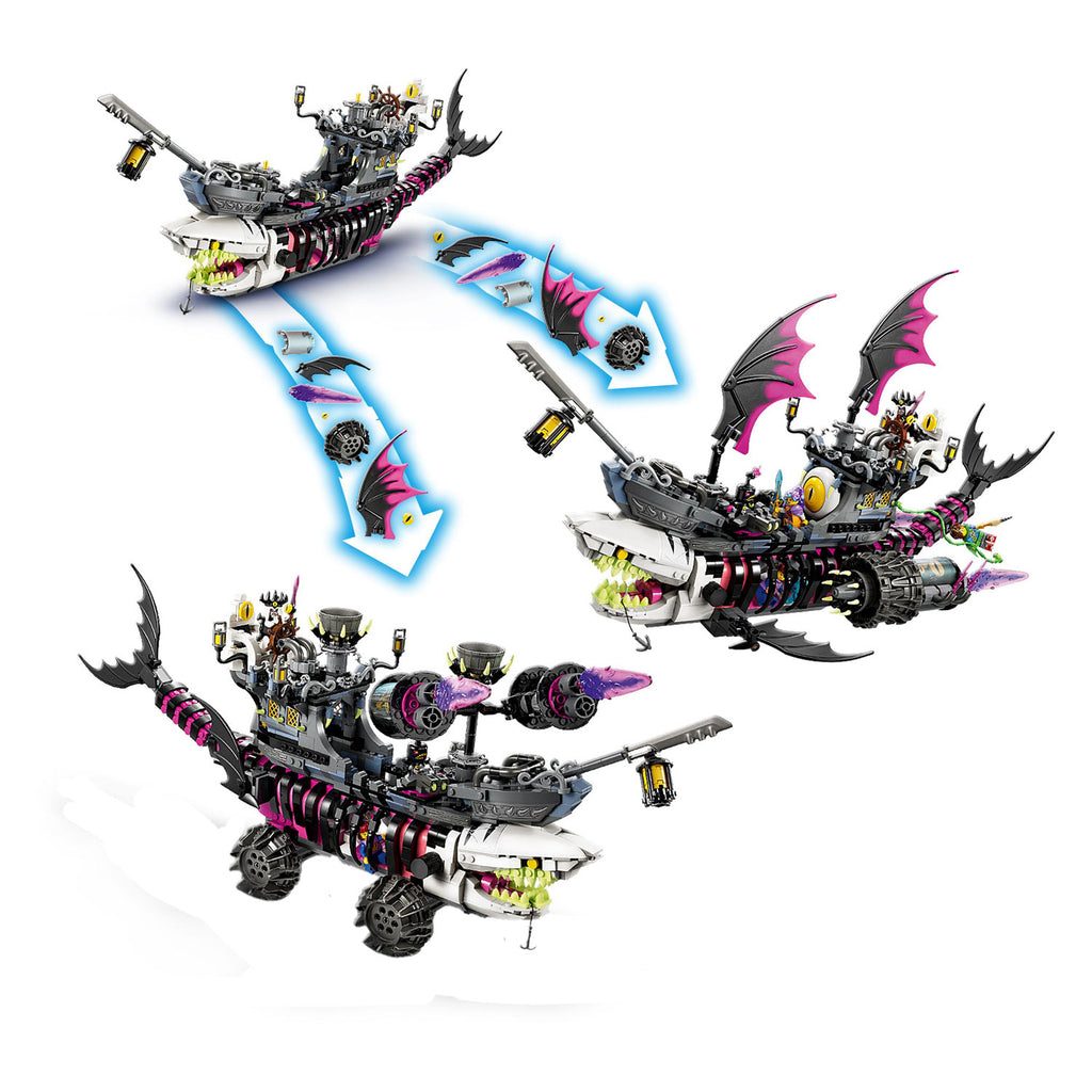 Kinderen vanaf 10 jaar kunnen in de actie van de droomwereld duiken met deze LEGO DREAMZzz Nachtmerrie haaienschip (71469) bouw- en speelset. De Nachtjager heeft Izzie's favoriete knuffel gevangen en gecombineerd met een piratenschip om een gevaarlijk monstervoertuig te maken, dat kinderen nu kunnen bouwen.1 voertuig, 2 manieren om te bouwenKinderen kunnen het voertuig op 2 manieren bouwen �?? als schip of als tank. De scheepsmodus heeft krachtige motoren en zeilen, terwijl de tankmodus coole accessoires en vliegende oogballen heeft. De 2 bouwmogelijkheden stimuleren de creativiteit en zorgen voor dubbel zo veel speeltijd.Coole functiesHet haaienschip heeft kenmerken waar kinderen weg van zullen zijn. Ze kunnen de bek openen en er een minifiguur in plaatsen, op een knop drukken om een geheime schatkist te ontdekken en de cabine aan de achterkant verwijderen. Het schip is ook uitgerust met draaibare geschutskoepels aan beide kanten en heeft een kooi en een valluik in het midden.