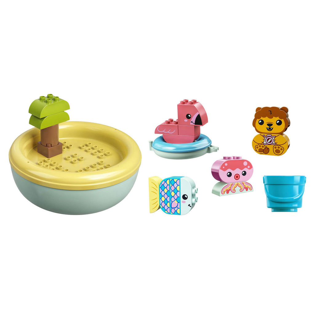 Het LEGO DUPLO Pret in Bad: Drijvend Diereneiland (10966) badspeelgoed voor baby's en peuters vanaf anderhalf jaar oud is een educatieve speelgoedset vol functies voor kinderen die van dieren houden Maak van de badtijd van je peuter een leuk verblijf op een tropisch eiland met heel wat speel- en leerplezier! Inclusief vier DUPLO-dierenfiguren: de vriendelijke leeuw staat op zijn drijvend paradijselijk eiland, terwijl de flamingo op een ring drijft, en een vis en octopus in het water plonzen. Kinderen kunnen de dieren wassen met de emmer. Er groeit ook een boom op het eiland. Je kunt het eiland opsplitsen in 2 aparte drijvende delen en het is gemakkelijk schoon te houden, bad na bad.