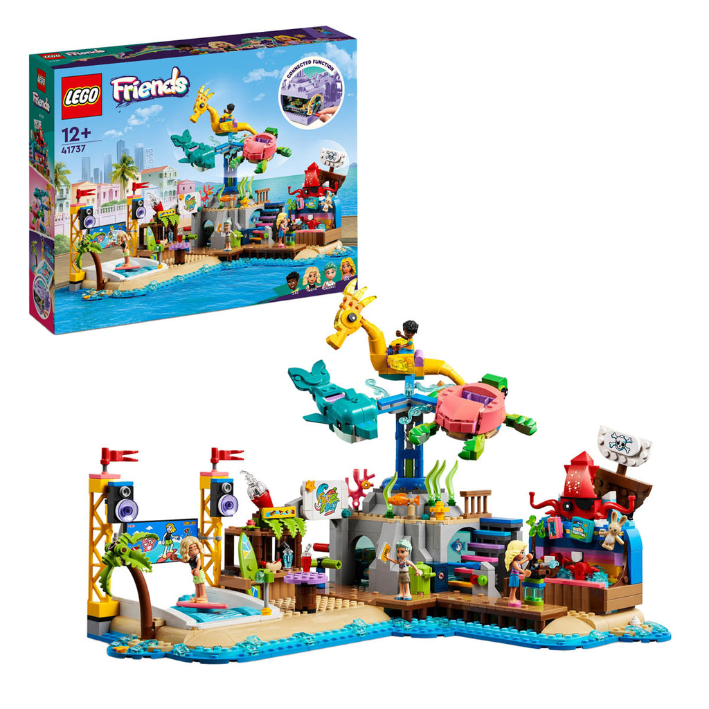 Klaar om je LEGO® bouwvaardigheden op de proef te stellen? Met dit gedetailleerde LEGO Friends Strandpretpark kun je alle elementen van een pretpark aan het strand in elkaar zetten. De set bevat LEGO Technic elementen die extra beweging en realisme toevoegen aan dit indrukwekkende model. Laat de 4 personages genieten van de draaiende attractie, de golfmachine en het schietspel.