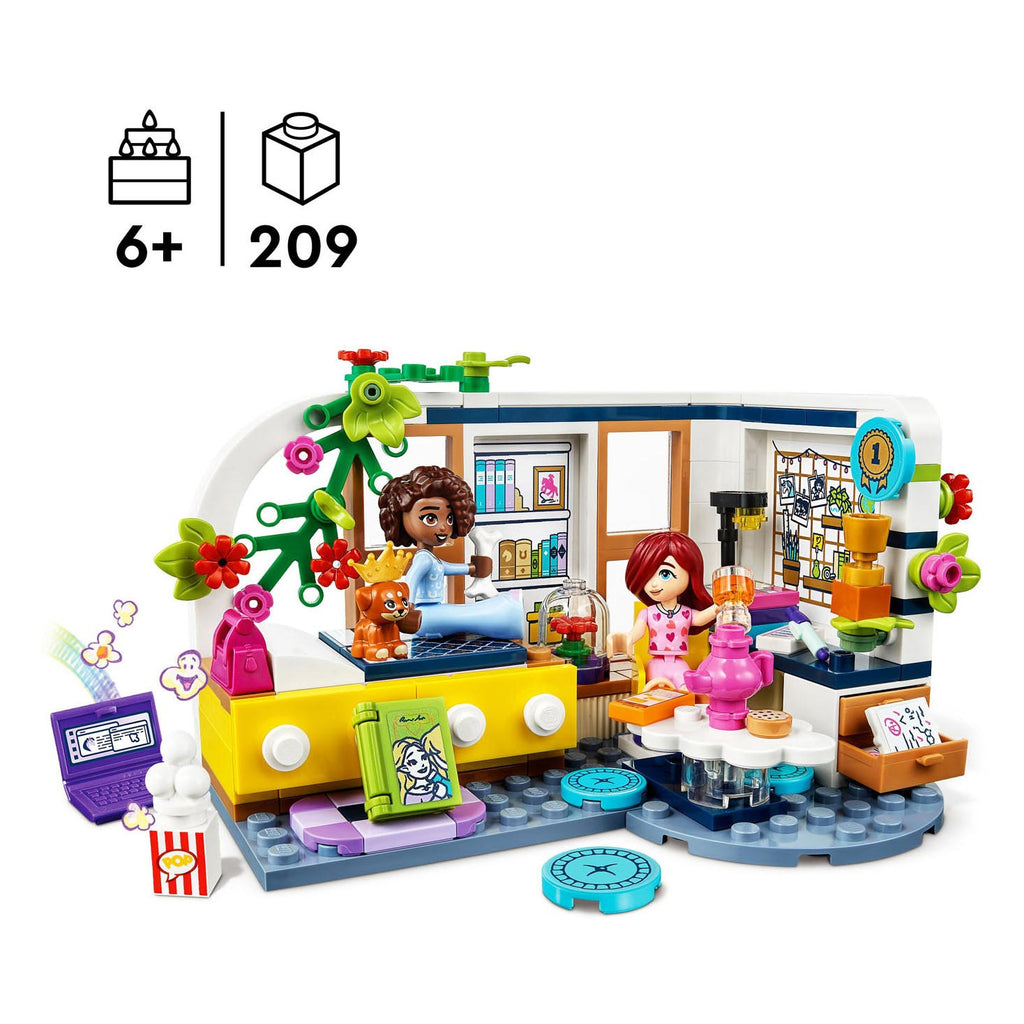 Kinderen vanaf 6 jaar kunnen hun eigen verhalen verzinnen met deze LEGO Friends Aliya's kamer (41740) bouwset, waarin Paisley en Aliya samen verhalen schrijven tijdens hun logeerpartij. De LEGO Friends speelset bestaat uit een bouwbare slaapkamer vol details, plus 2 minipoppetjes van Aliya en Paisley, en een speelgoedhuisdier. De kamer weerspiegelt Aliya's leergierige aard met accessoires zoals schriften, een draaistoel, laptop, boek, lamp en trofee. Leuk detail: het werkstuk waar Aliya een onvoldoende voor kreeg en dat ze heeft verstopt onder haar stapel tienen! Misschien kan Paisley haar helpen om niet zo streng voor zichzelf te zijn. Als het tijd is om te ontspannen, is er een groot scherm om films te kijken en hondenaccessoires om met Aliya's puppy te spelen. In Heartlake City kunnen kinderen van alles beleven: van dieren verzorgen tot boodschappen doen en de kamers van de LEGO Friends personages uit de serie voor 2023 verkennen. Kinderen kunnen dit speelgoed verzamelen en combineren met andere LEGO Friends slaapkamer speelsets. Het compacte formaat maakt dit het ideale reisspeelgoed; een perfect cadeau-idee voor meisjes en jongens die dol zijn op huisdieren en poppenhuizen.Afmetingen: ca. 8 cm hoog, 13 cm breed en 10 cm diep.Bevat 209 onderdelen.