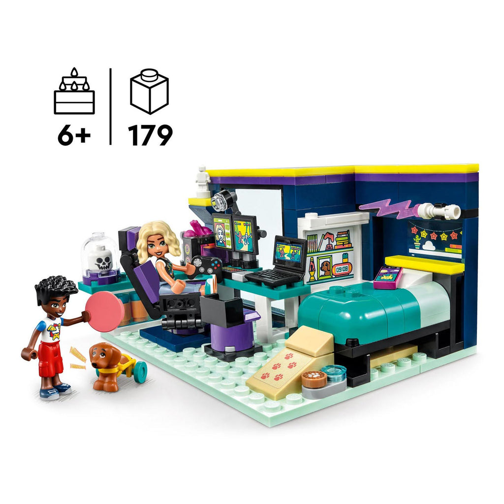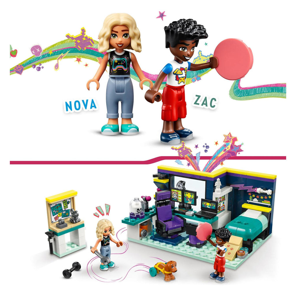 Kinderen vanaf 6 jaar kunnen veel ontdekken met deze LEGO Friends Nova's kamer (41755) speelset. Zac dacht dat hij niet veel gemeen had met Nova, totdat hij ontdekte dat ze van gamen houdt �?? net als hij! Nu kunnen ze hun vriendschap opbouwen terwijl ze samen spelen. Deze compacte set met reisspeelgoed is inclusief 2 LEGO Friends minipoppetjes van Nova en Zac. Kinderen kunnen de slaapkamer van Nova verkennen, met een gaming-pc met toetsenbord en neon ventilatoren, een gamingstoel en een microfoon. Ze kunnen helpen met het verzorgen van Nova's huisdier, de geredde pup Pickle. Er is een werkbank waar Nova de wielen van Pickle kan repareren, plus een helling om hem op het bed te helpen. Leuke details zoals de verborgen poster laten Nova's andere interesses zien.LEGO Friends speelgoed is ideaal voor kinderen die houden van bouwen en creatief spel. Door levensechte avonturen in Heartlake City na te spelen, leren ze de personages uit de tv-serie voor 2023 kennen. Deze set met speelgoed om te verzamelen is een echte aanrader voor kinderen die helemaal weg zijn van gamen en creatieve verhalen bedenken met minipoppetjes.Afmetingen: ca. 7 cm hoog, 12 cm breed en 11 cm diep.Bevat 179 onderdelen.