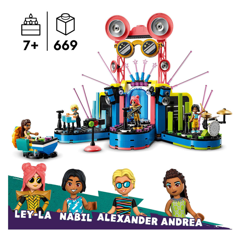 Met de LEGO Friends Heartlake City muzikale talentenjacht speelset kunnen kinderen hun eigen shows geven! Deze speelset is geschikt voor meisjes en jongens vanaf 7 jaar. Het bevat een podium met een backstagegedeelte, een jurytafel, 4 LEGO Friends mini poppetjes en veel accessoires.