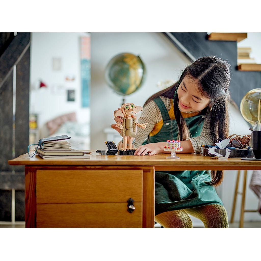 De direct herkenbare figuur heeft een beweegbaar hoofd en verstelbare armen en vingers zodat Dobby de meegeleverde accessoires kan vasthouden. Er is een gedetailleerd bouwbaar model van Harry Potters sok met het dagboek van Marten Vilijn dat Harry gebruikte om Dobby te bevrijden en tante Petunia's 'zwevende' taart om herinneringen aan klassieke scènes op te roepen. Dit bouwbare displaymodel van Dobby de huis-elf is ca. 19 cm hoog en vormt een magisch cadeau voor kinderen en verzamelaars van Harry Potter memorabilia. Plaats de figuur van Dobby op de bouwbare standaard met naamplaatje om de blikvanger af te maken en de aandacht van elke voorbijganger te trekken. Gun je kind een eenvoudig en intuïtief bouwavontuur met de Builder app. Hiermee kun je inzoomen en modellen in 3D draaien, sets opslaan en de voortgang bijhouden. 403-delig. Geschikt voor kinderen vanaf 8 jaar.