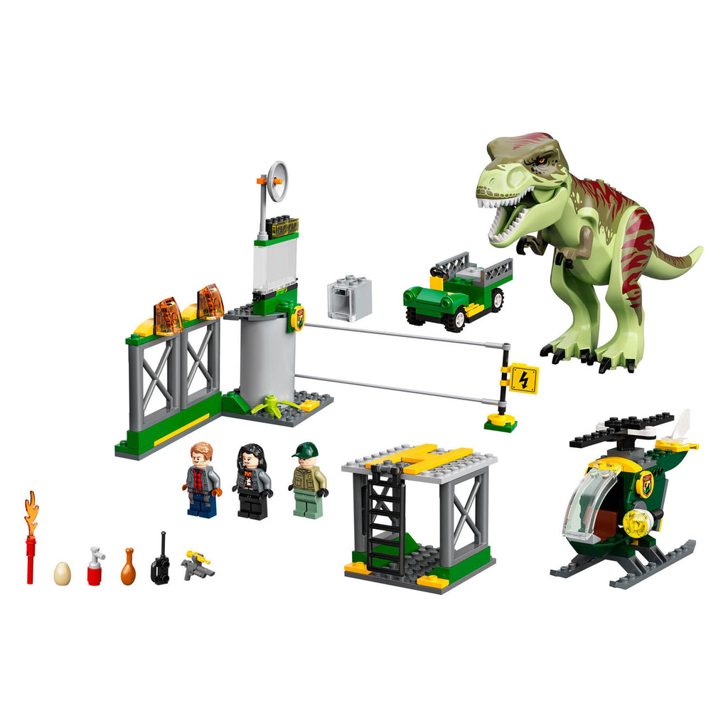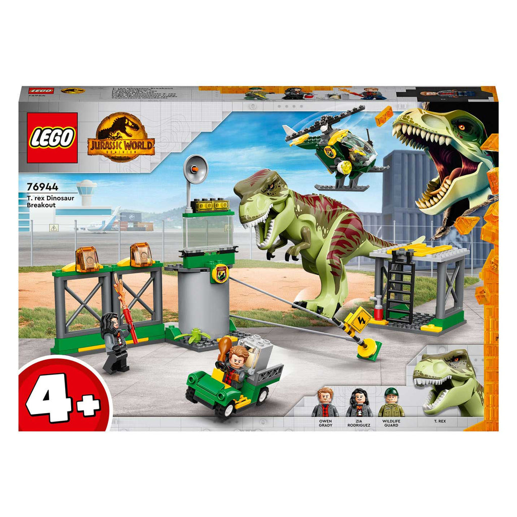 Geniet van spannende dinosaurusactie met deze LEGO Jurassic World T.rex dinosaurus ontsnapping (76944) speelset voor kinderen vanaf 4 jaar. Dit leuke constructie speelgoed is geïnspireerd op de film Jurassic World: Dominion. Kinderen kunnen scènes uit de film naspelen of hun eigen verhalen bedenken met deze bouwset met een vliegveld met helikopterplatform, een helikopter, een dinofiguur van een T.rex en een speelgoedauto. Met boeiende details, zoals een kist waarin een dinosaurus-ei veilig getransporteerd kan worden en diverse accessoires. De T.rex probeert te ontsnappen op het vliegveld. Niets kan hem tegenhouden: zelfs het hek stort in wanneer de dinosaurus er tegenaan loopt. Aan Owen Grady, Zia Rodriguez en de wildbeschermer de taak om de reusachtige dinosaurus tegen te houden! Achtervolg de T.rex vanuit de helikopter zodat iedereen veilig blijft. Met deze LEGO Jurassic World set beleven kinderen urenlang speelplezier met het steeds weer bedenken van nieuwe scenario's en rollenspellen. De duidelijke instructies met afbeeldingen bij deze set zijn ideaal voor kinderen die net leren lezen. Het bouwen van de modellen wordt nog leuker met interactieve digitale instructies, beschikbaar in de gratis LEGO Bouwinstructies app. Jonge kinderen die gek zijn op dino's en coole voertuigen zullen het geweldig vinden om te leren bouwen met dit constructie speelgoed. Het is dan ook een geweldig cadeau voor dinofans die de wereld van hun favoriete personages uit de Jurassic World-films willen ontdekken. Het vliegveld is ca. 15 cm hoog, 16 cm breed en 6 cm diep, en de T. rex is ca. 11 cm hoog. Bevat 140 onderdelen.