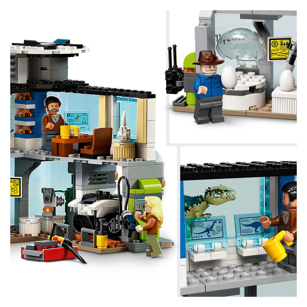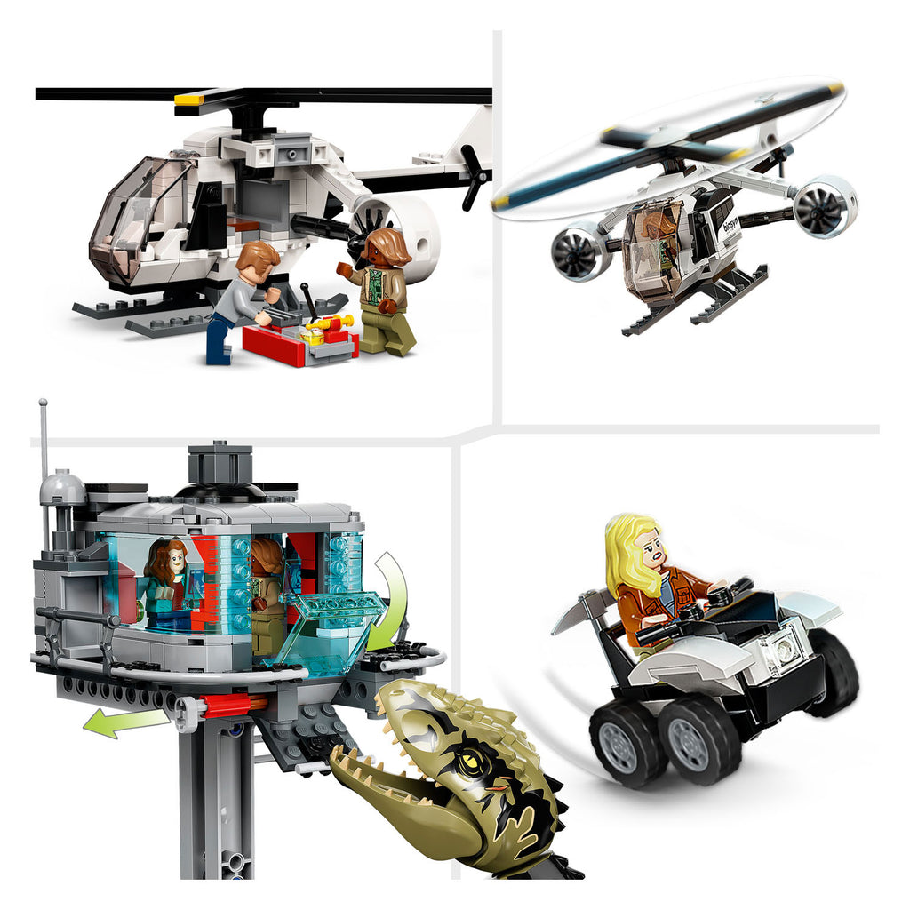 Fans van de film Jurassic World: Dominion kunnen de legendarische actie herbeleven met dit geweldige Giganotosaurus & Therizinosaurus aanval (76949) speelgoed. Kinderen beleven urenlang fantasierijke pret met dit dinosaurus speelgoed, waarmee ze spannende verhalen tot leven kunnen brengen. Dit hoogwaardige LEGO Jurassic World speelgoed voor kinderen van 9 jaar en ouder bevat 6 minifiguren: Owen Grady, Claire Dearing, Dr. Alan Grant met een fossielelement, Dr. Ellie Sattler, Kayla Watts en Dr. Henry Wu. De set bevat bovendien 2 dino figuren die kunnen bewegen, een bouwbaar hoofdkwartier met een gedetailleerd lab, een garage voor de terreinwagen, een observatietoren met functie waarmee het platform in kan storten, een helikopter met draaiende propellers en een laadruim. Dankzij de eenvoudige, geïllustreerde instructies kunnen zelfs beginnende LEGO bouwers vol vertrouwen genieten van het bouwproces. Er zijn LEGO Jurassic World bouwsets voor fans van alle leeftijden, met dino figuren, populaire personages, coole voertuigen en nog veel meer voor urenlang speelplezier. Deze speelset met 2 dinosaurussen is een cool cadeau voor kinderen die gek zijn op dieren en Jurassic World films. Het lab is ca. 16 cm hoog, 21 cm lang en 16 cm breed. De Giganotosaurus is ca. 32cm lang Bevat 810 onderdelen