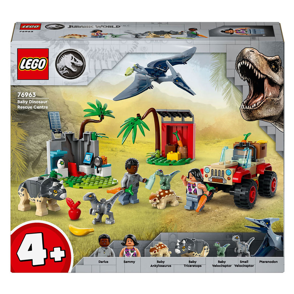 Met de LEGO Jurassic World Reddingscentrum voor babydinosaurussen (76963) set kunnen jonge fans vanaf 4 jaar spelen en tegelijkertijd leren bouwen met dino's. Deze set bevat een terreinwagen en een onderzoeksgebied met een grotmuur, beide met startsteenelementen, evenals een voederstation. Het spelen kan snel beginnen met 2 minifiguren en speelgoed dinosaurus figuren, waaronder een jonge Ankylosaurus, Triceratops, Velociraptor, een kleine Velociraptor en een volwassen Pteranodon.