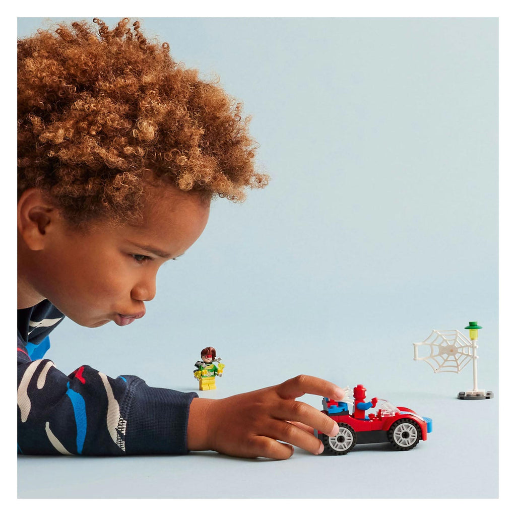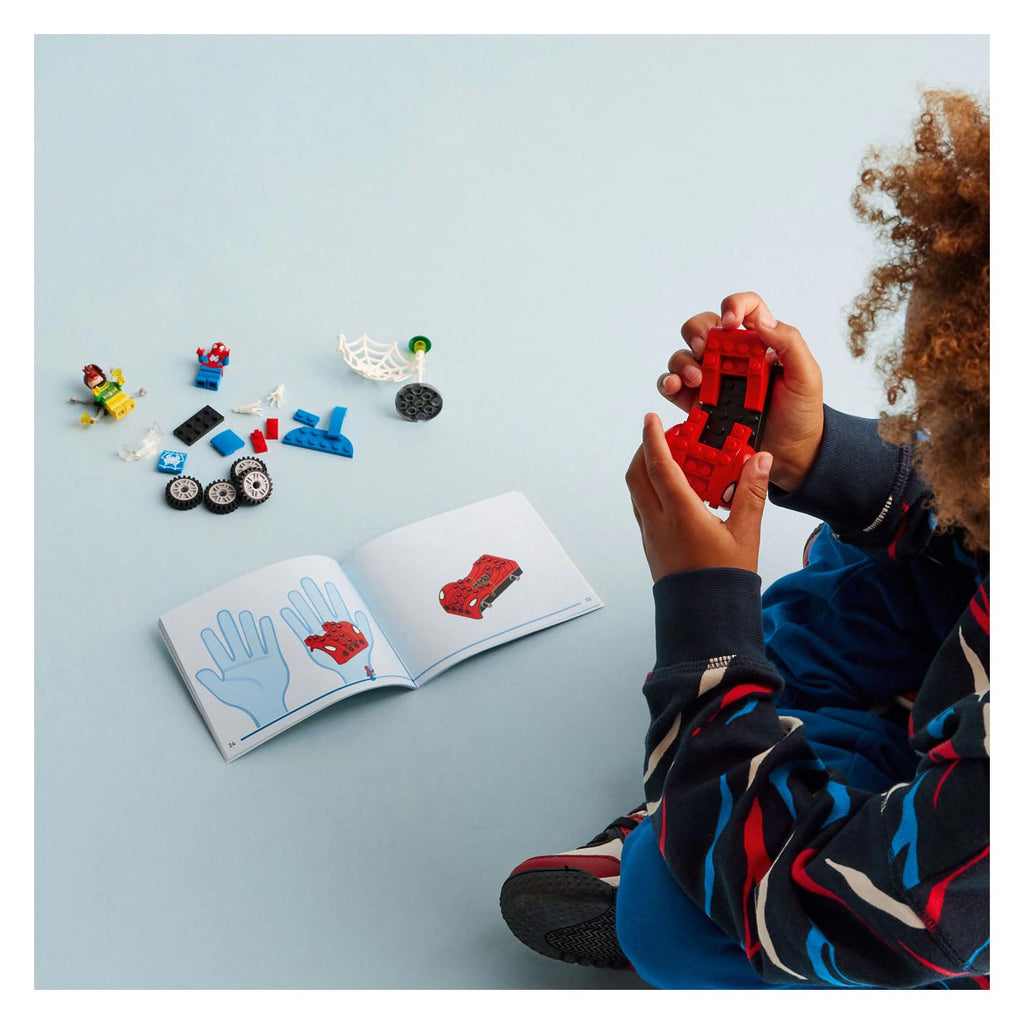 Laat kinderen kennismaken met hun favoriete superheld met deze LEGO Marvel Spider-Man's auto en Doc Ock (10789) set. Deze speelset is leuk Spidey speelgoed voor kinderen vanaf 4 jaar en bevat bekende personages, een supercoole auto en geweldige accessoires, waaronder een Spider-Man Webschieter. Kinderen beleven webslingerende actie met Spidey en Doc Ock met deze LEGO set, met een diamantroof als middelpunt van eindeloze fantasierijke avonturen. De spannende set bevat 2 Spider-Man minifiguren - Spidey en Doc Ock - plus Spidey's auto met 2 glow-in-the-dark webelementen. Het speciale startsteenchassis van de auto moedigt kinderen aan om Spidey's auto zelf te bouwen. De Spidey and his amazing friends set bevat simpele instructies in de vorm van een kleurrijk stripverhaal en de LEGO Builder app biedt extra digitaal plezier door middel van intuïtieve zoom- en draaifuncties waarmee kinderen hun model kunnen visualiseren terwijl ze het bouwen. Met 4+ sets kunnen ouders samen met hun kinderen bouwen, of ze nu doorgewinterde LEGO fans zijn of voor het eerst kennismaken met LEGO stenen. Het Spider-Man constructie speelgoed is een geweldig cadeau voor een verjaardag of een andere bijzondere gelegenheid. Afmetingen: de auto is ca. 4 cm hoog, 8 cm lang en 4 cm breed. Bevat 48 onderdelen.