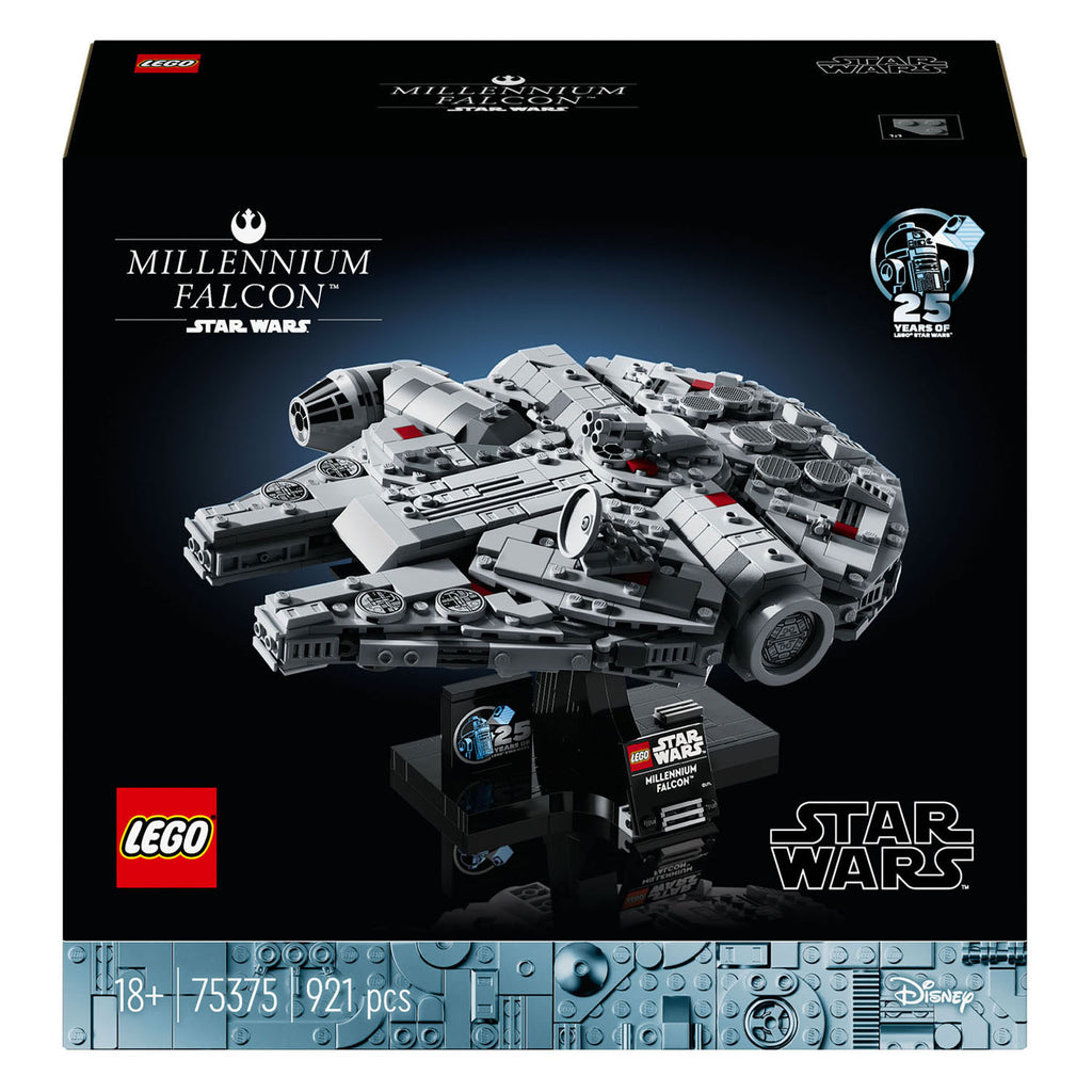 De klassieke Star Wars saga gaat verder in je woonkamer met dit LEGO Star Wars Millennium Falcon ruimteschip om neer te zetten (75375). Focus als een Jedi om de authentieke details uit Star Wars: A New Hope na te bouwen. Zet je creatie neer op een bouwbare standaard die is ontworpen om de LEGO Millennium Falcon vanuit een dynamische hoek te laten zien. Voeg het naamplaatje en de jubileumsteen ter ere van 25 jaar LEGO Star Wars toe om een blikvanger te maken die nostalgische herinneringen zal oproepen.Dit bouwbare Star Wars ruimteschip bouwpakket voor volwassenen maakt deel uit van de LEGO Star Wars ruimteschipcollectie op middelgrote schaal. Het is een leuke traktatie voor jezelf of een fraai Star Wars cadeau voor andere fans en verzamelaars of zij die op zoek zijn naar een creatieve hobby.Deze unieke LEGO voor volwassenen biedt een complexe, creatieve bouwuitdaging. Maak de ervaring nog leuker met de LEGO Builder app, waar je kunt inzoomen en je modellen in 3D kunt draaien, je voortgang kunt bijhouden en al je sets op één plek kunt opslaan.Afmetingen: dit LEGO Star Wars Millennium Falcon ruimteschip is ca. 13 cm hoog, 24 cm lang en 19 cm breed.Bevat 921 onderdelen.