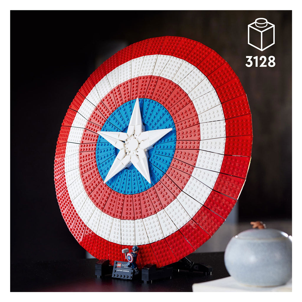 Het schild van Captain America is een van de bekendste voorwerpen uit het Marvel Cinematic Universe. Nu kun je dit symbool van de strijd van goed tegen kwaad zelf in huis halen. Dit schijfvormige model van 3128 onderdelen heeft een diameter van ca. 47 cm en staat op een standaard met een naamplaatje. Om je pronkstuk nog interessanter te maken, is er ook een minifiguur van Captain America inbegrepen.