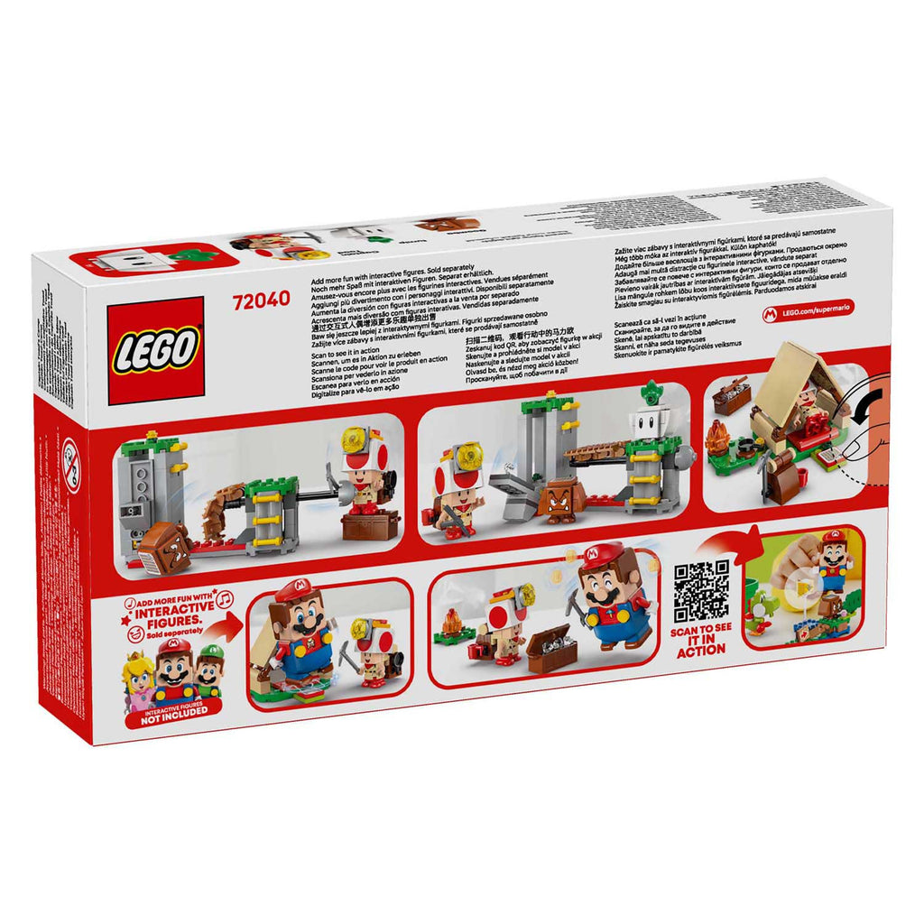 Verken Toad-baas' kampeerplaats en ga op zoek naar verborgen schatten met deze leuke LEGO® Super Mario™ speelgoedset voor kinderen (72040). Dit cadeautje voor jongens, meisjes en fans vanaf 6 jaar bevat een bouwbare tent met een kampvuur voor Toad-baas, een brug die kan instorten, verborgen 'diamanten' en een schatkist. Er zijn ook 3 LEGO Super Mario figuren van Toad-baas, een Goomba en een knol, plus accessoires, waaronder een bouwbare rugzak, houweel en pan voor creatieve rollenspellen. Voeg een LEGO® Mario™, LEGO® Luigi™ of LEGO® Peach™ figuur toe (uit set 71439, 71440, 71441 of 72043 – apart verkrijgbaar) voor interactief speelplezier, waaronder digitale reacties als ze op de actietag van de tent springen en de Goomba verslaan. Je vindt de bouwinstructies voor deze Nintendo® LEGO set in de doos en in de LEGO Super Mario app. Bekijk ook de andere LEGO Super Mario sets (apart verkrijgbaar). Deze set bevat 159 onderdelen.