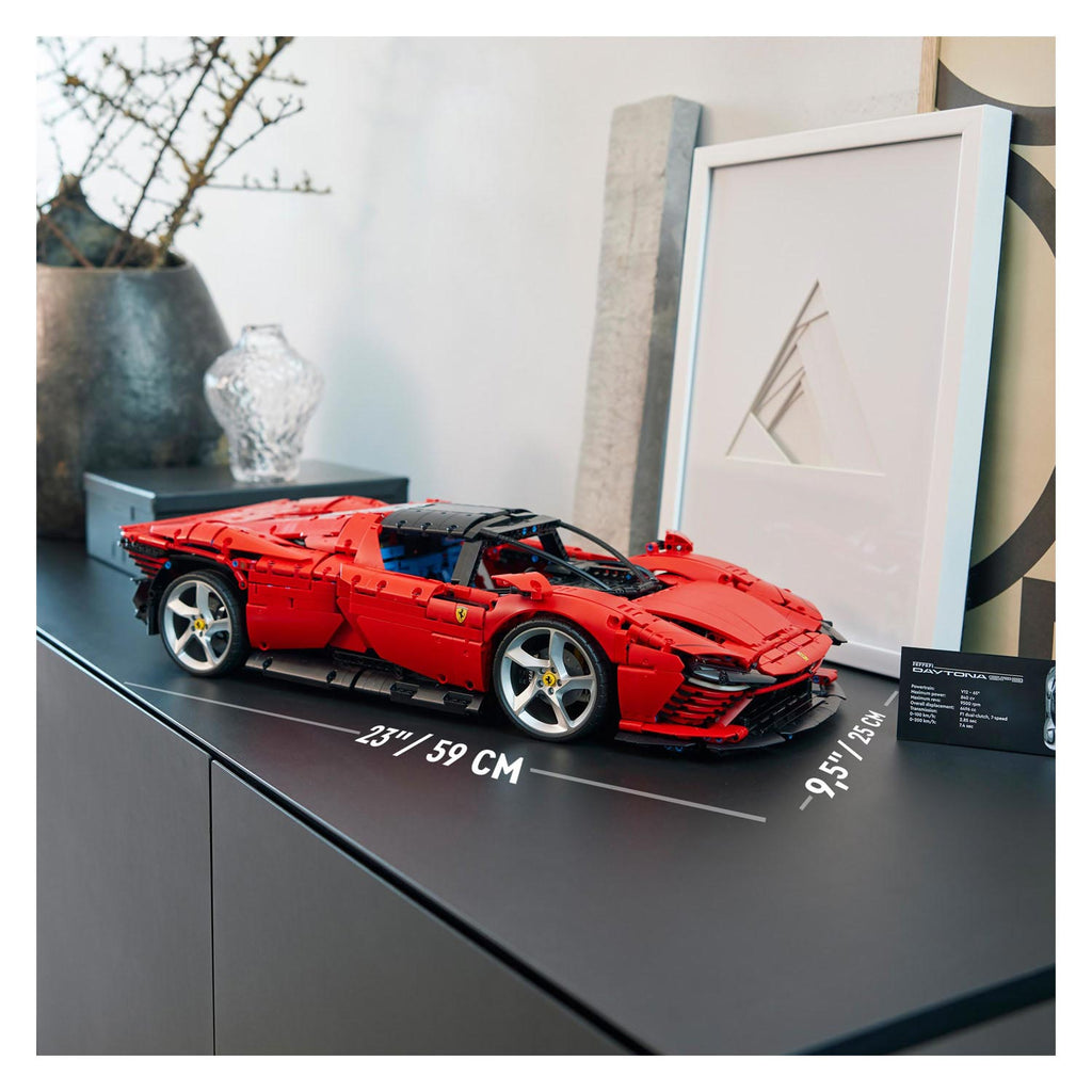 Een indrukwekkende creatie voor volwassen Ferrari fans in de LEGO® Technic Ultimate Car Concept serie. Neem wat tijd voor jezelf en bouw dit Ferrari Daytona SP3 model met zijn klassieke rode kleur en verchroomde velgen. Zet het daarna op een mooi plekje en bewonder de opvallende achterkant en ronde lijnen die dit schaalmodel (1:8) zo bijzonder maken. Een bijzonder staaltje techniek Deze replica van de echte Ferrari heeft realistische functies, zoals werkende besturing, een sequentiële versnellingsbak met 8 versnellingen, schakelflippers en een V12-motor met bewegende zuigers. De Ferrari beschikt net als de originele supercar over vlinderdeuren die open kunnen. Open de motorkap en bekijk je unieke serienummer, waarmee je online speciale content kunt vinden. Neem de toeristische route De LEGO Technic Ultimate Car Concept serie is samengesteld voor volwassenen. Deze geavanceerde modellen brengen een ode aan de meest exclusieve voertuigen en vormen prachtige cadeaus voor autoliefhebbers. Een supercarmodel voor volwassenen – bouw alle details van de Ferrari Daytona SP3 na met deze LEGO® Technic Ferrari Daytona SP3 (42143) bouwset voor volwassen fans Uit de LEGO® Technic Ultimate Car Concept serie – de 4e aanwinst binnen deze serie supercarmodellen: een reeks verzamelmodellen die zijn geïnspireerd op enkele van de meest luxe voertuigen ter wereld Ontworpen in samenwerking met Ferrari – het model beschikt over werkende besturing, een sequentiële versnellingsbak met 8 versnellingen en schakelflippers, vlinderdeuren die open kunnen, een afneembaar dak en schokdempers Fraai autocadeau voor Ferrari fans – dit bouwbare supercarmodel is ontworpen voor volwassen LEGO® bouwers en Ferrari fans. Ze krijgen daarmee een gedetailleerd bouwproject dat ze vol trots op een mooi plekje kunnen neerzetten Gemaakt om gezien te worden – de set is inclusief een versierde displayplaat en een uniek serienummer waarmee je toegang krijgt tot speciale online content Geniet van het uitpakken – dit automodel wordt geleverd in een exclusieve verpakking met een fraai uitgevoerd boekje, waarin je een kijkje achter de schermen krijgt bij de samenwerking tussen de LEGO® ontwerpers en Ferrari Afmetingen – dit schaalmodel (1:8) van een supercar is ca. 14 cm hoog, 59 cm lang en 25 cm breed Waar voert de reis je heen? – het LEGO® Technic universum biedt een bouwervaring voor gevorderden met talloze modellen die speciaal zijn ontworpen voor volwassen bouwers Kwaliteit staat voorop – LEGO® Technic onderdelen voldoen aan strenge industrienormen, waardoor ze consistent, compatibel en comfortabel in elkaar te zetten en uit elkaar te halen zijn Veiligheid gegarandeerd – LEGO® Technic onderdelen worden gegooid, verhit, geplet, gedraaid en geanalyseerd om er zeker van te zijn dat ze voldoen aan strikte wereldwijde veiligheidsnormen Een indrukwekkende creatie voor volwassen Ferrari fans in de LEGO® Technic Ultimate Car Concept serie. Neem wat tijd voor jezelf en bouw dit Ferrari Daytona SP3 model met zijn klassieke rode kleur en verchroomde velgen. Zet het daarna op een mooi plekje en bewonder de opvallende achterkant en ronde lijnen die dit schaalmodel (1:8) zo bijzonder maken. Een bijzonder staaltje techniek Deze replica van de echte Ferrari heeft realistische functies, zoals werkende besturing, een sequentiële versnellingsbak met 8 versnellingen, schakelflippers en een V12-motor met bewegende zuigers. De Ferrari beschikt net als de originele supercar over vlinderdeuren die open kunnen. Open de motorkap en bekijk je unieke serienummer, waarmee je online speciale content kunt vinden. Neem de toeristische route De LEGO Technic Ultimate Car Concept serie is samengesteld voor volwassenen. Deze geavanceerde modellen brengen een ode aan de meest exclusieve voertuigen en vormen prachtige cadeaus voor autoliefhebbers.