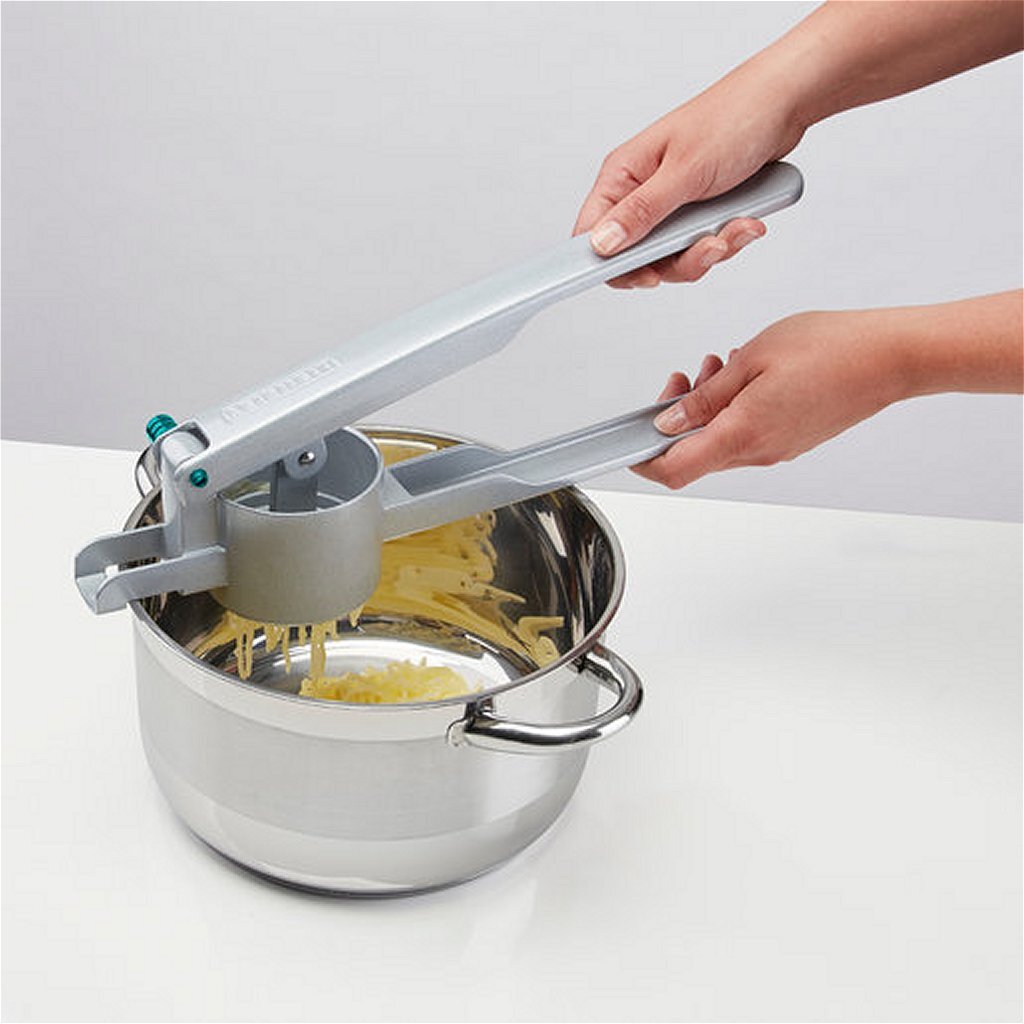 Of het nu gaat om aardappelpuree of andere groentepuree - met depureeknijper kunnen deze gerechten gemakkelijk worden geproduceerd.De keukenhulp bestaat uit een stabiele constructie: het persgegoten zink maakt de pers bijzonder robuust en duurzaam.Het is ideaal voor de eenvoudige productie van aardappelpuree.Dankzij de grote opening is hij gemakkelijk te vullen.Praktische steunhaken zorgen ervoor dat hij de potten stevig vasthoudt zonder om te vallen.Ook uitermate geschikt voor het moeiteloos produceren van spaghetti-ijs, vruchtensappen of fruit- en groentepuree.Na het bereiden van de lekkernijen, is gemakkelijk het weer schoon te maken - met de hand of in de vaatwasser.Omdat depureeknijper kan worden gedemonteerd dankzij de verwijderbare pin.Op deze manier kunnen restanten van het deeg gemakkelijk worden verwijderd.