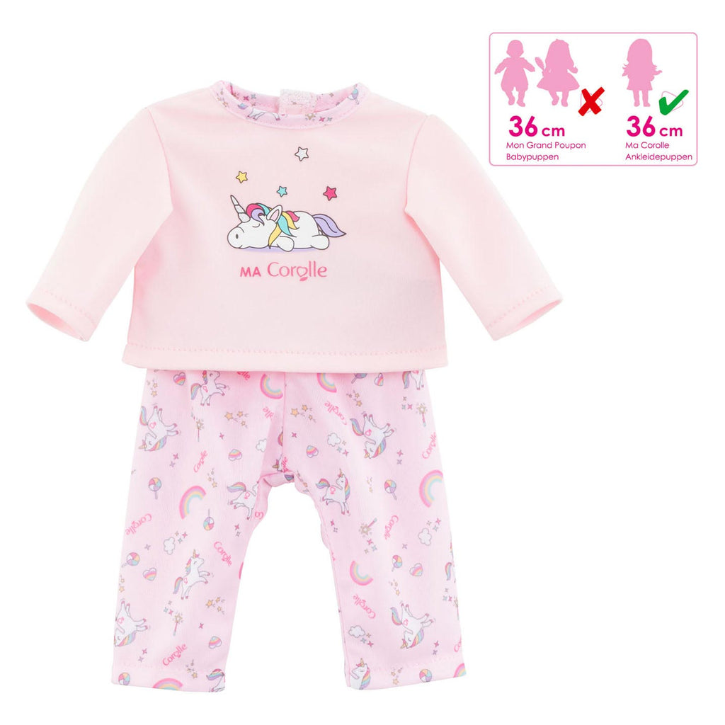 Poppenpyjama voor poppen van 36 centimeter. De pyjama bestaat uit een lichtroze broek en shirt met lange mouwen met print van een slapende eenhoorn. Geschikt voor kinderen vanaf 4 jaar oud.