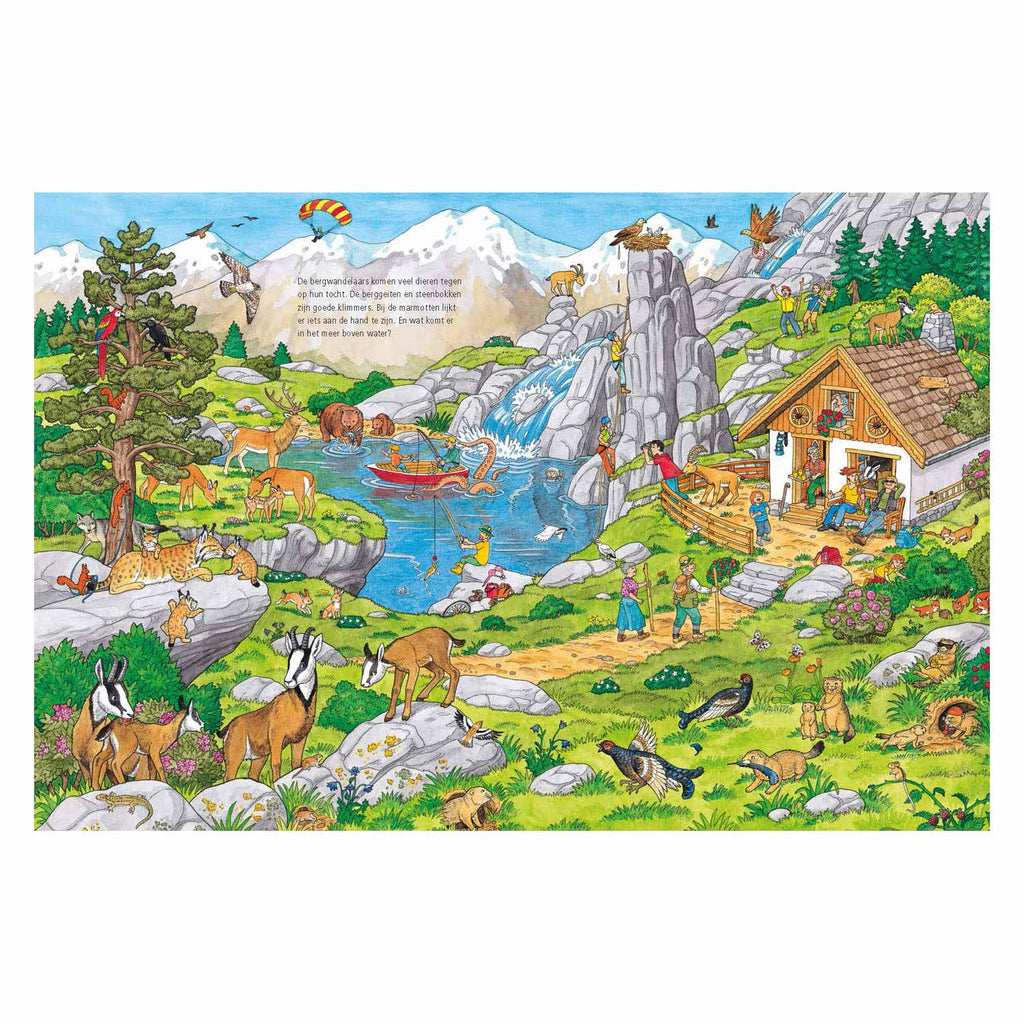 Welkom in de vrolijke wereld van de dieren! In het bos dicht bij huis, in het verre Afrika of in het hoge noorden... ga met ons mee op ontdekkingsreis naar de dieren over de hele wereld. Zoek het lieve reekalfje, de ijsberen of kijk naar de olifanten die een bad nemen. Midden in deze bonte dierendrukte heeft een papegaai zich verstopt. Vind je hem?