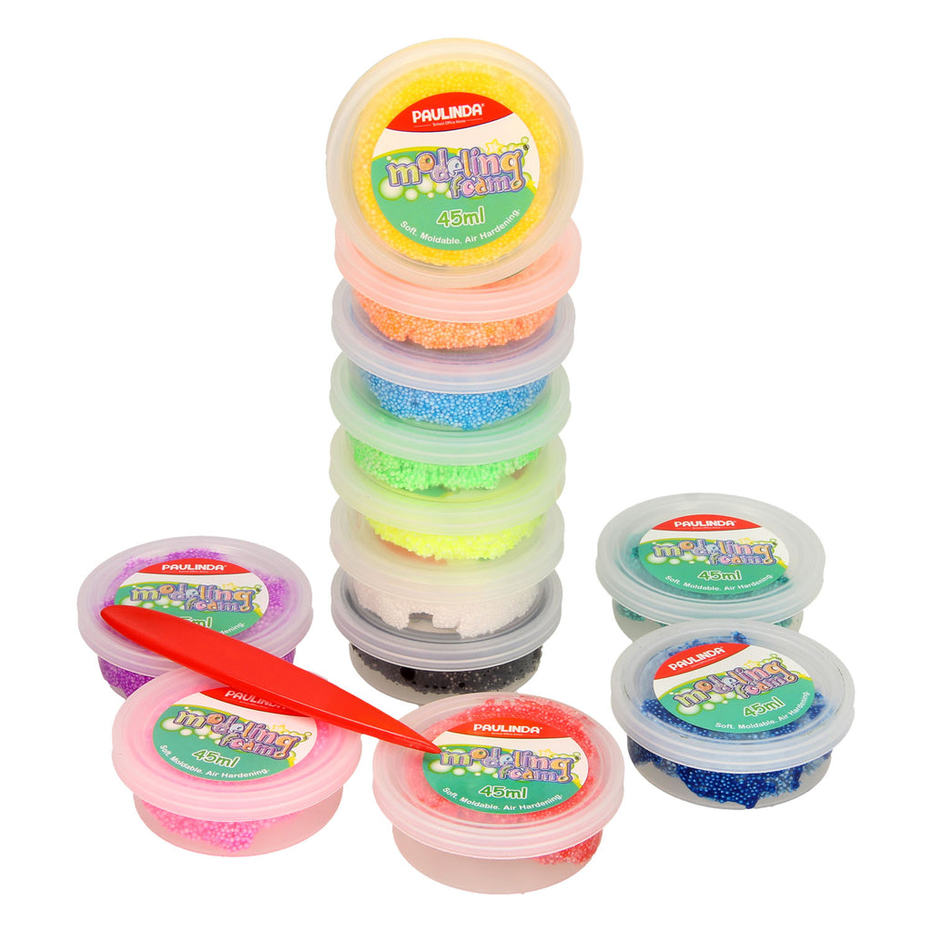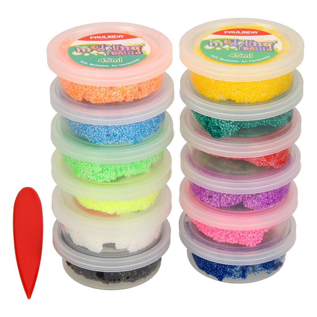Modeling Foam klei is klei dat bestaat uit kleine foam balletjes en wordt gebruikt om verschillende ondergronden te bekleden. De klei droogt aan de lucht, is veilig en goed kneedbaar. Er is geen oven nodig om de klei in te bakken. Deze set bestaat uit 12 kleurenpotjes modeling foam in de kleuren: rood, geel, donkerblauw, donkergroen, zwart, wit, roze, lijmgroen, lichtblauw, groen, geel en paars. Goed voor uren kleiplezier!
