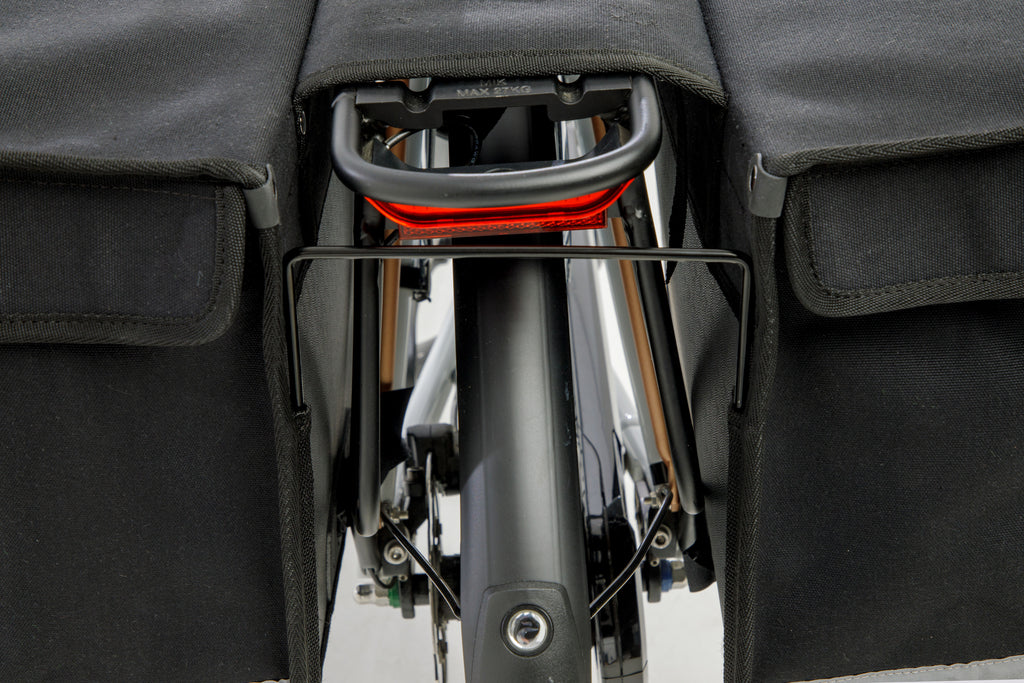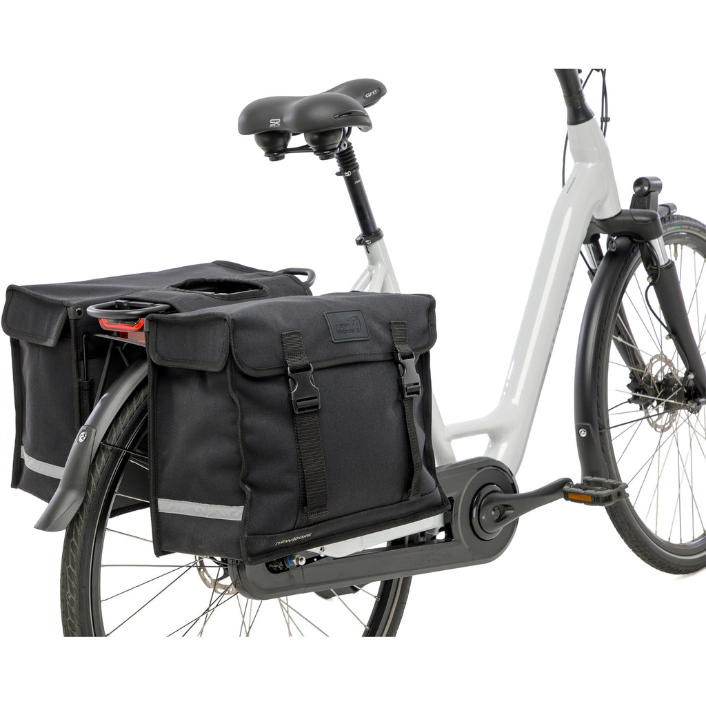 New Looxs de Luxe dubbele tas nr. 30 afmeting: 39x33x18 46 liter zwart, Dubbel gestikt met ijzersterk garen, Art.nr. 030.330 •Stevige, ruime fietstas gemaakt van waterafstotend canvaslook polyester •Zeer geschikt als boodschappentas •Met kliksluiting •Reflectie voor extra zichtbaarheid •Te gebruiken met afstandhouder (niet inbegrepen) •Ruimte voor snelbinders Dit zijn oersterke, grote dubbele boodschappentassen, ideaal als je veel ruimte nodig hebt om spullen mee te nemen op de fiets. Gemaakt van waterafstotend polyester in een canvaslook. De New Looxs Double Pannier Deluxe hebben wij al meer dan 40 jaar in onze collectie. Deze tassen hebben zich dus wel bewezen! Veel ruimte Dit is een echte ruime fietstas, met een inhoud van 46 liter een van de grootste dubbele tassen van New Looxs. Als de tas vol zit dan houd je de tas goed bij elkaar door het extra aantrekbandje binnen in de tas. Daardoor gaat de tas niet openhangen. Je sluit de tas met kliksluitingen. De naden zijn dubbel gestikt en daarmee extra sterk. De tassen hebben een extra sterke achterplaat voor de stevigheid. Past op (bijna) elke fiets De fietstas wordt aan de bagagedrager bevestigd met riempjes. Dat maakt deze tas geschikt voor vrijwel alle fietsen, ook elektrische. De brug tussen de twee delen van de tas is 16,5 cm. Je kunt de fietstas extra vastzetten aan de zijkant van de bagagedrager met een klittenband riempje. Je zet de tas 1 keer vast en daarna zit deze goed bevestigd op de drager. De snelbinders zijn gewoon te gebruiken in combinatie met deze tas. Wij raden bij zwaar gebruik van deze tas aan om een New Looxs afstandhouder te gebruiken. Deze voorkomt dat de tas tegen het wiel aan komt als de tas zwaar beladen is. Je steekt de afstandhouder in de insteekstrips op de achterkant van de fietstas. Veilig onderweg Deze dubbele tas is gemaakt van waterafstotend polyester met canvas look. Als je de klep dichtmaakt is de tas goed bestand tegen kleine regenbuien. Het materiaal is ook nog eens erg sterk. Voor de veiligheid is deze tas afgewerkt met reflectie voor een betere zichtbaarheid in het donker. New Looxs Deluxe dubbele fietstas. Afmeting: 39 x 18 x 33 cm, inhoud 46 liter in de kleur zwart. Gemaakt van waterafstotend polyester met canvas uitstraling. Zeer geschikt als boodschappentas. Voorzien van kliksluiting en reflectie.