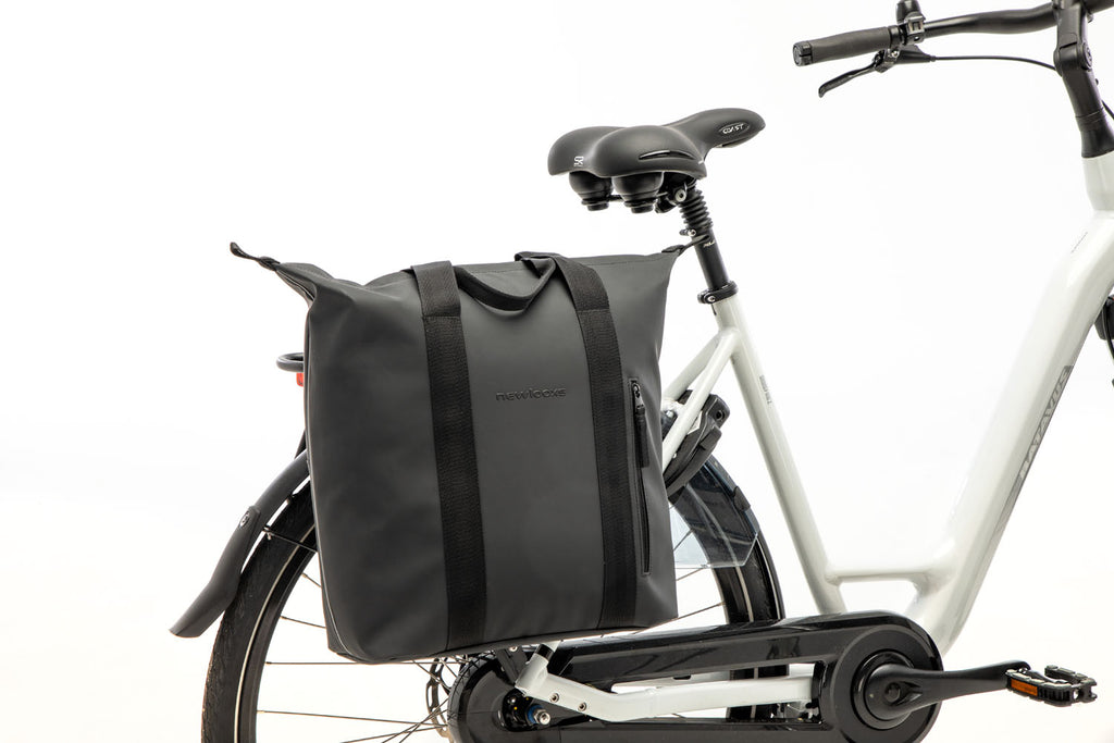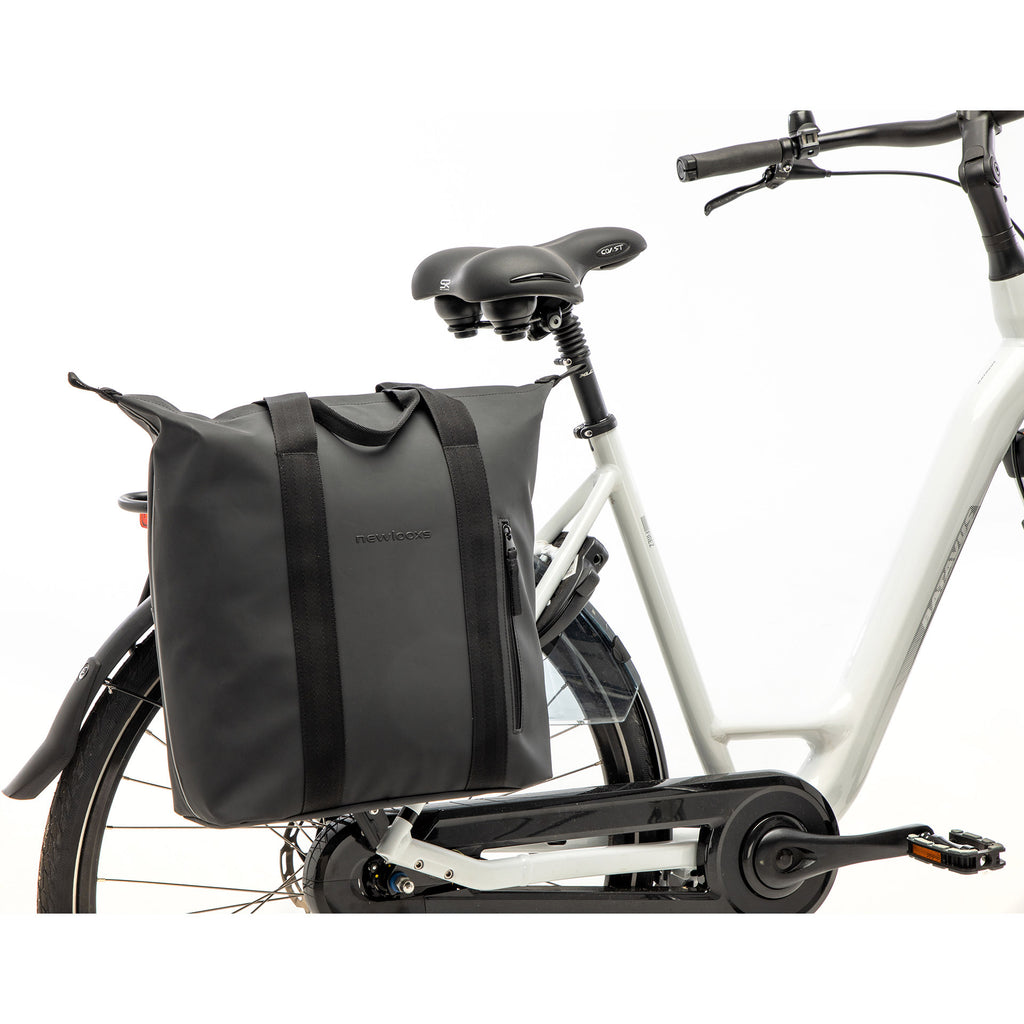 Deze ruime enkele zwarte fietstas met stoere looks is perfect voor boodschappen. Het ruime hoofdvak biedt voldoende ruimte om extra veel mee te nemen. De tas kan eenvoudig aan de bagagedrager worden bevestigd met behulp van de kunststof haken van New Looxs. Wanneer je de tas van de fiets haalt, kun je de haken afdekken met het ritsvakje, waardoor de tas eruitziet als een mooie moderne shopper. De tas heeft zowel voorop als binnenin een extra ritsvak, zodat je kleine items veilig kunt opbergen. Het hoofdvak kan ook worden afgesloten met een rits, waardoor je spullen goed beschermd zijn. Productspecificaties: - Kleur: zwart - Kleurnaam: black - Materiaal: polyester - Afmetingen: 45 x 18 x 36 cm - Montage: haken - Type tas: shopper - Inhoud: 24 liter