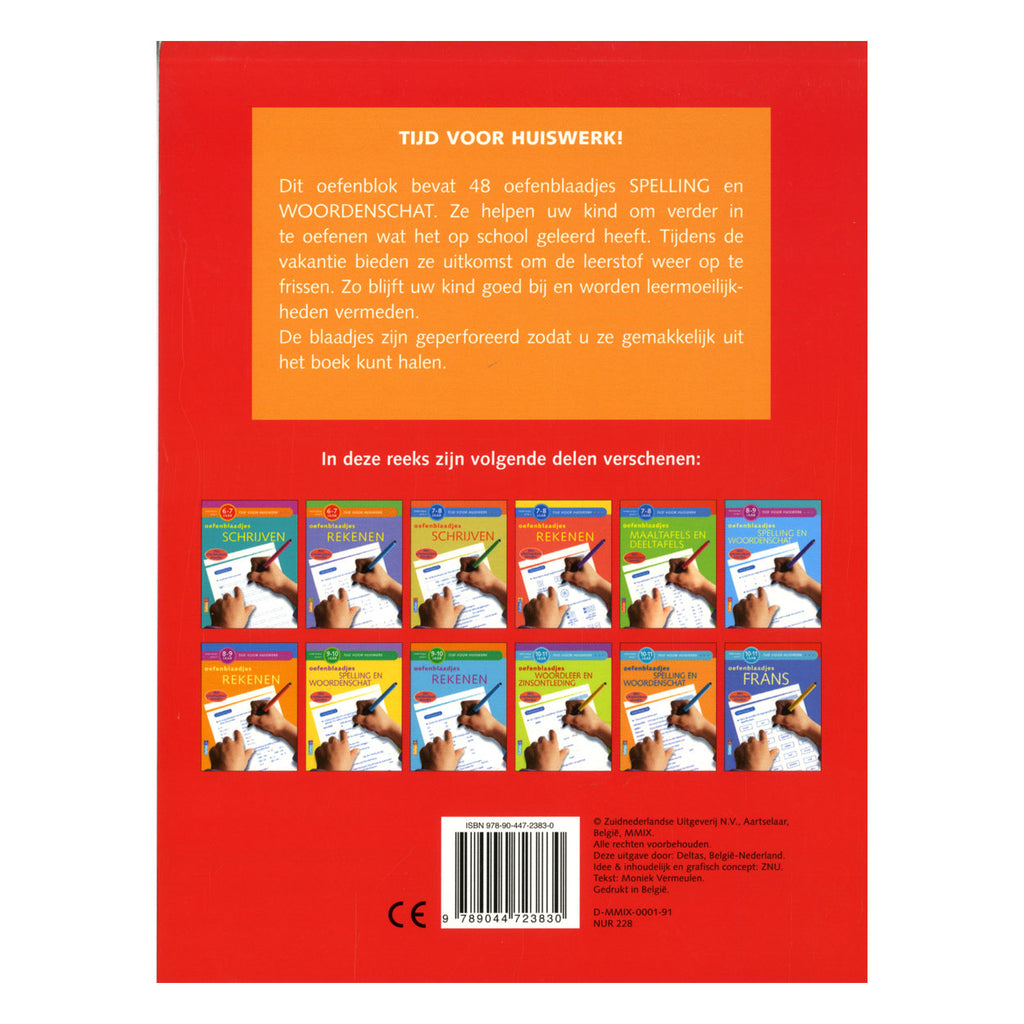 Dit oefenblok bevat 48 oefenblaadjes spelling en woordschat. Ze helpen uw kind om verder in te oefenen wat het op school geleerd heeft. Tijdens de vakantie bieden ze uitkomst om de leerstof weer op te frissen. Zo blijft uw kind goed bij en worden leermoeilijkheden vermeden. De blaadjes zijn uitneembaar, zodat ze op een flexibele wijze gebruikt kunnen worden.Inhoud: 96 pagina's. Paperback uitvoering.