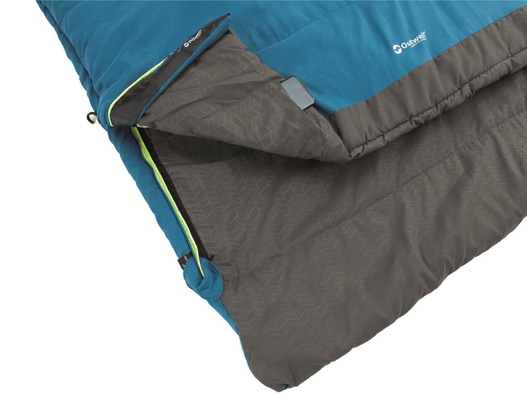 De Outwell Celebration is een zachte, warme tweepersoons slaapzak. De slaapzak is gevuld met een dubbele laag Isofill en daarom geschikt voor gebruik van het late voorjaar tot het vroege najaar. De voering en buitentijk bestaan uit heerlijk zacht geborsteld polyester. De zachte voering is bovenaan omgeklapt, wat nog eens extra comfortabel is. De rits is over de gehele lengte voorzien van een ritsklep en is van beide kanten te openen. De slaapzak kan ook geheel worden open geritst tot een tweepersoons deken. De Outwell Celebration slaapzak heeft een comforttemperatuur van 2°C voor mannen en 6°C voor vrouwen.