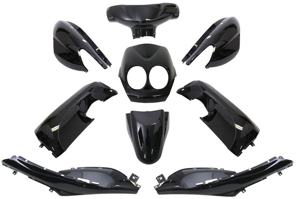 Plaatset 9 delig passend op de Yamaha Neo's - MBK Ovetto vanaf bouwjaar 2008 tot bouwjaar 2011. Deze set bestaat uit de volgende 9 delen: Stuurkap Voorscherm Voorscherm onderzijde Links en Rechts Achterscherm Links Achterscherm Rechts Voorspatbord Onderkap zijskirt Links en Rechts
