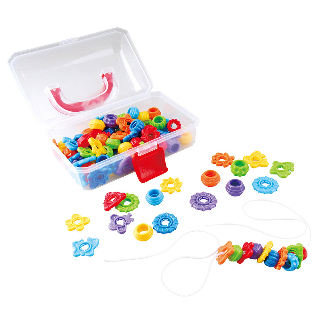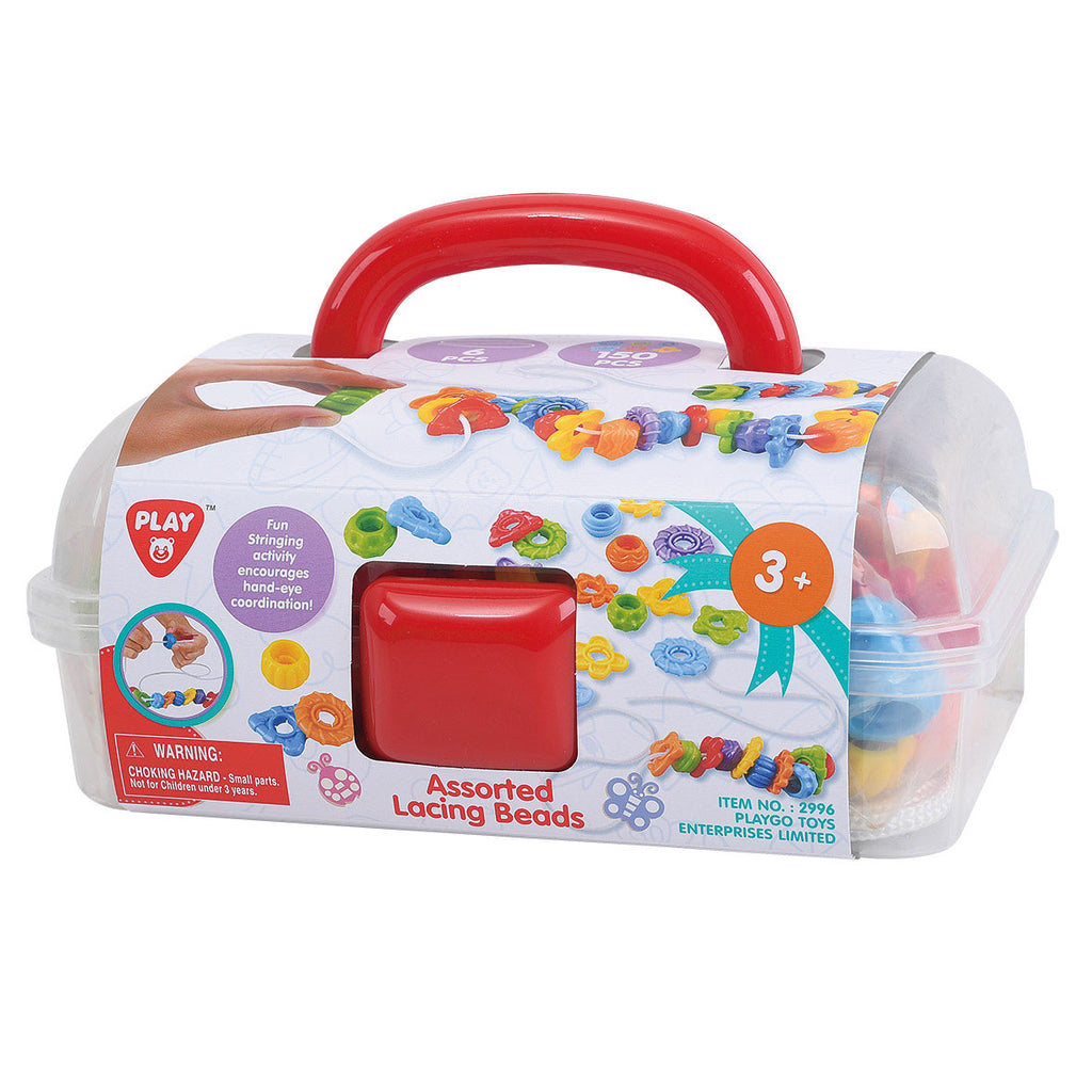 Maak de mooiste kettingen met de rijgkralen uit deze koffer van Play. De koffer bevat 150 kralen in verschillende kleuren en vormen en 6 draden om mee te rijgen. Spelen met de rijgkralen stimuleert de ontwikkeling van hand-oogcoördinatie en kleurherkenning. Na het spelen berg je alles gemakkelijk weer op in de transparante draagkoffer. De koffer en de kralen zijn gemaakt van stevig kunststof.